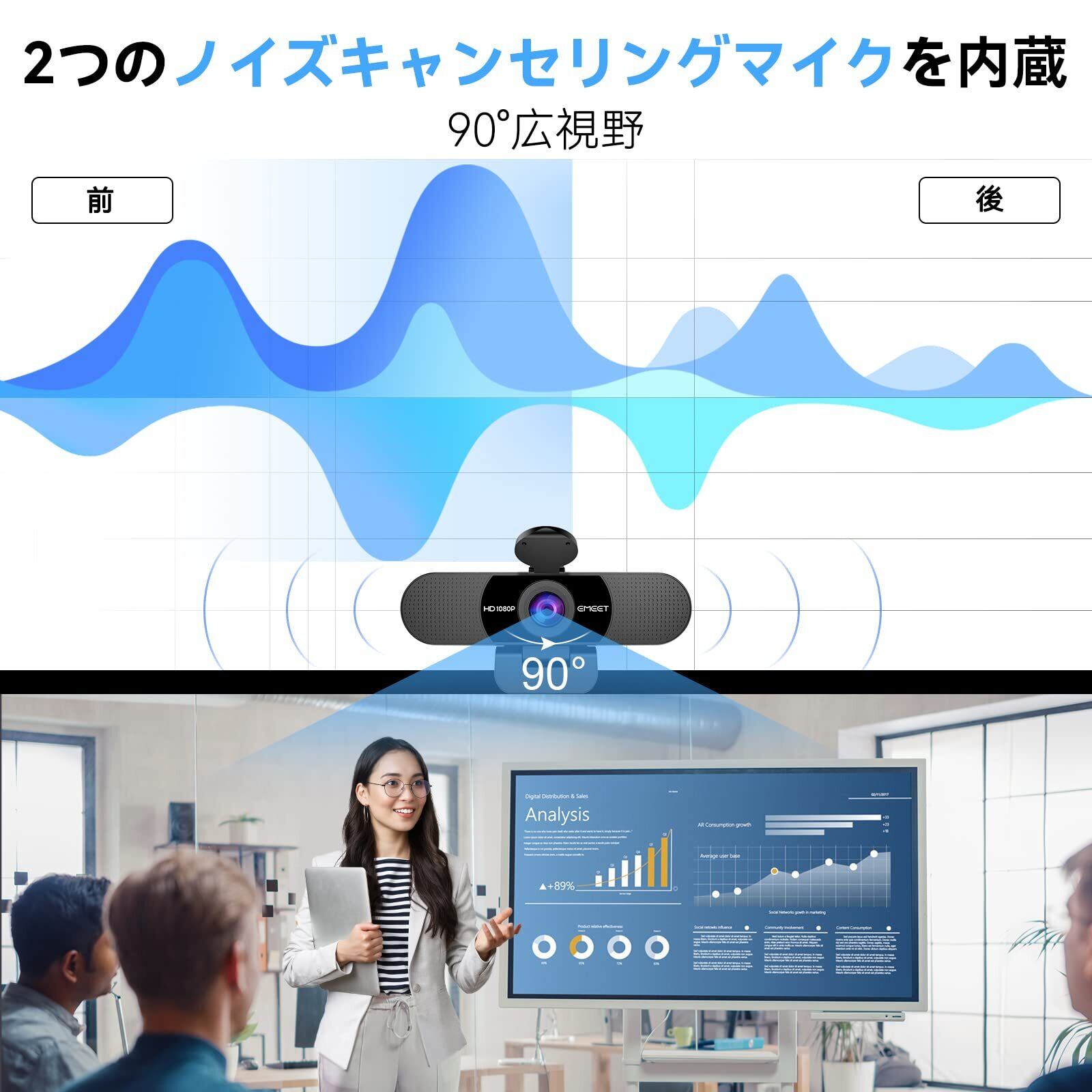 WEBカメラ EMEET C960 三脚付き ウェブカメラ HD1080P 90°広角 パソコンカメラ 内蔵マイク ノイズリダクション USB接続簡単 自動光補正 高さ調節 プライバシーカバー 会議用/授業用/ビデオ通話/生放送 Youtube, Skype, Facebook, zoom, Facetimeなど対応