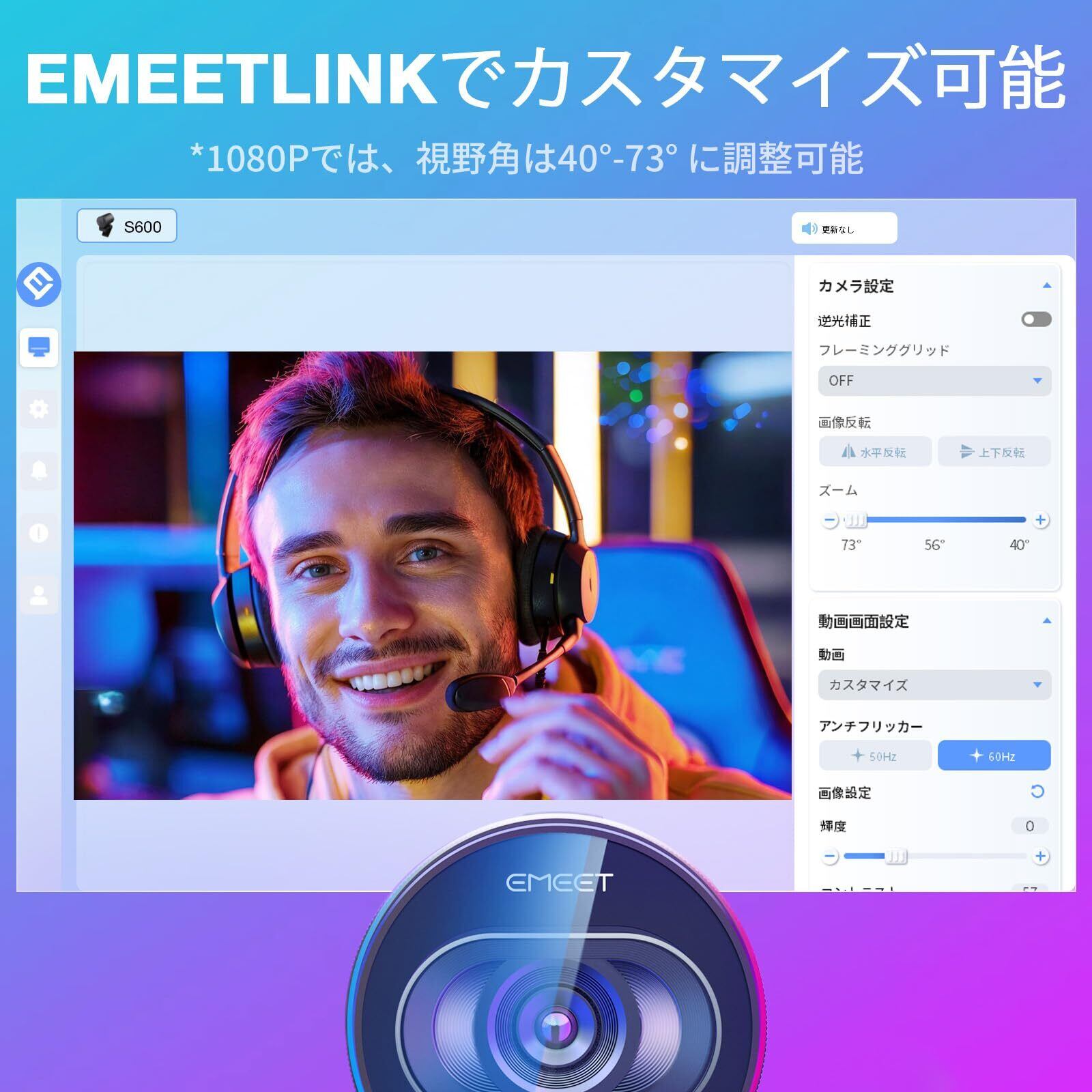 【設定簡単、パラメータ自由調整】EMEET USB ウェブカメラはドライバー不要、USBケーブルで差し込むだけですぐに使えます。ワーク一部として簡単に統合で、「ライブ配信」「動画撮影」「ウェブ会議」などのシーンに活躍します。また、EMEET製品専用のEMEETLINKソフトウェアを無料でダウンロードして、輝度、コントラスト、シャープネス、頻度など調整だけではなく、ファームウェアのアップデート設定などより細かな設定も可能です。