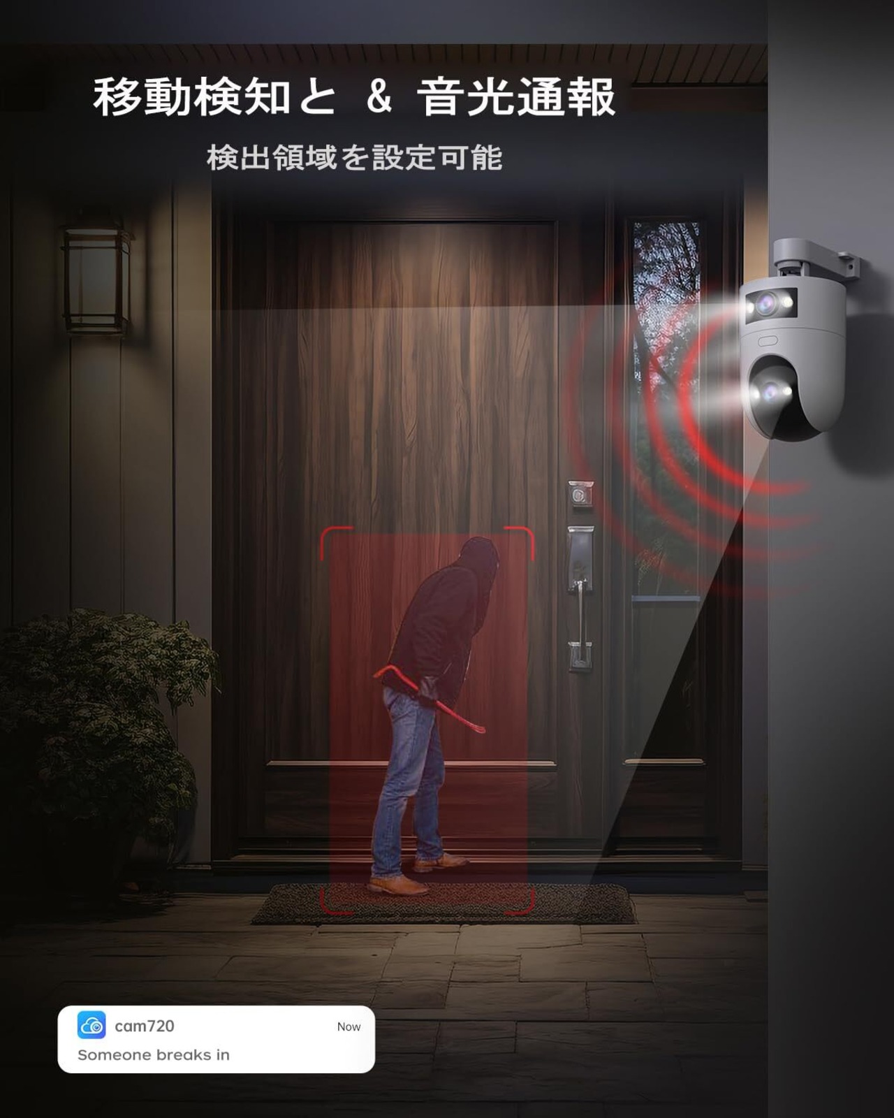 【動体検知 &警報通知機能・自動追跡】屋内防犯カメラは、人や物の動きを検知すると、自動的に追跡して、アラーム機能でスマホへ警報通知を送信します。「可聴アラーム」機能をオンにすると、動きを検知すると大きな音が鳴り、警告の役割を果たし、時間内に疑わしいイベントを停止します。録画機能でその時点のビデオを証拠として保存することも可能です。また、最新な二重カメラ複合機センサー付き、雨や飛んでいる昆虫など、ささやな変動による頻繁な誤報の検知アラームや録画を減らします