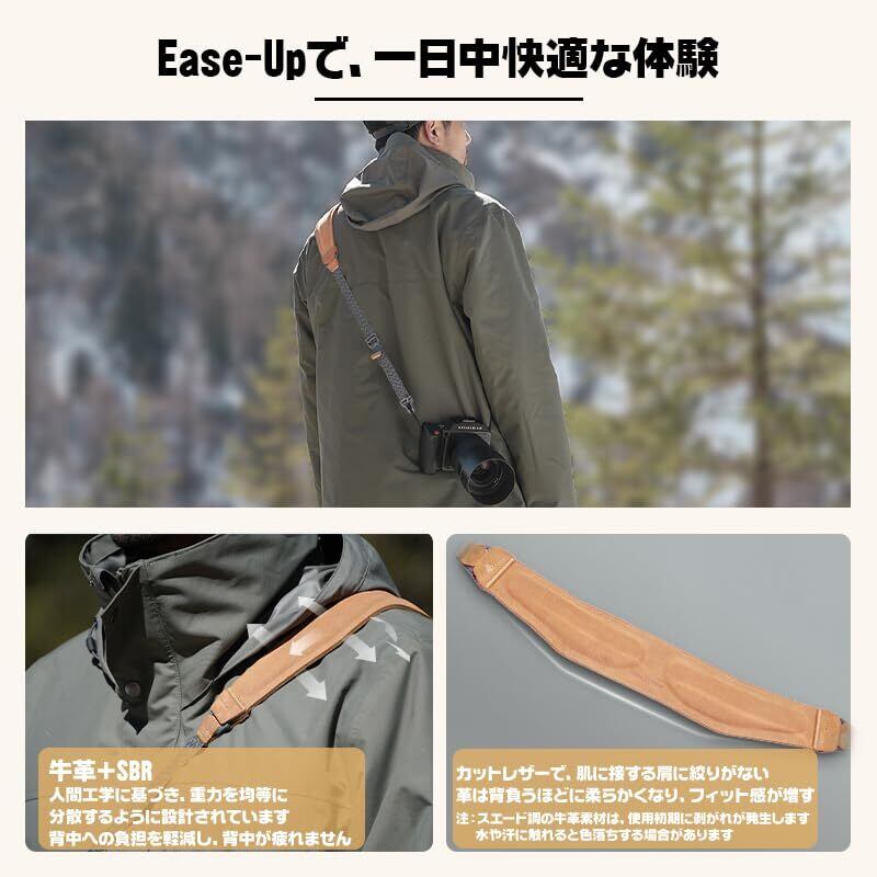 注意:スエード調の牛革索材は、使用初期に剥がれが発生します。それに水や汗に触れると色落ちする場合があります。使用の時は注意してください。注意:HasselbladX2Dカメラを使用する場合、購入前にカスタマーサービスに連絡してください。 このカメラの取り付け方法は他のカメラと異なるので、カスタマーサービスが正しい取り付け方法を説明します。