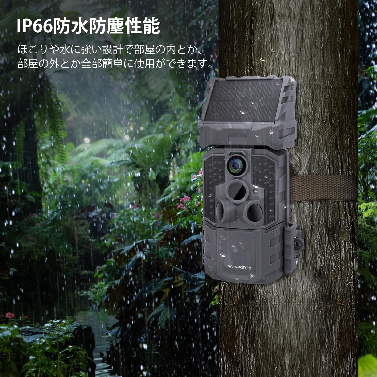 【IP66級防水・防塵 & 装置簡単 】IP66相当の防塵防滴性能を搭載し、天候を気にせず屋外にも設置できます。 (完全防水ではありませんが、悪天候時のご使用はお控えください。※雨による浸水故障は適用外となります。 ※水中では使用できません。)柱や木に巻き付ける固定ベルト、壁やコンクリート用の固定金具を付属しており、撮影したい場所に簡単に設置できます。配線不要、 一般的な監視カメラと比べて、のトレイルカメラは ソーラーパネルと乾電池式の利用可能で、配線工事不要、設置工事費不要て安価に設置ができます。装置とっても簡単!