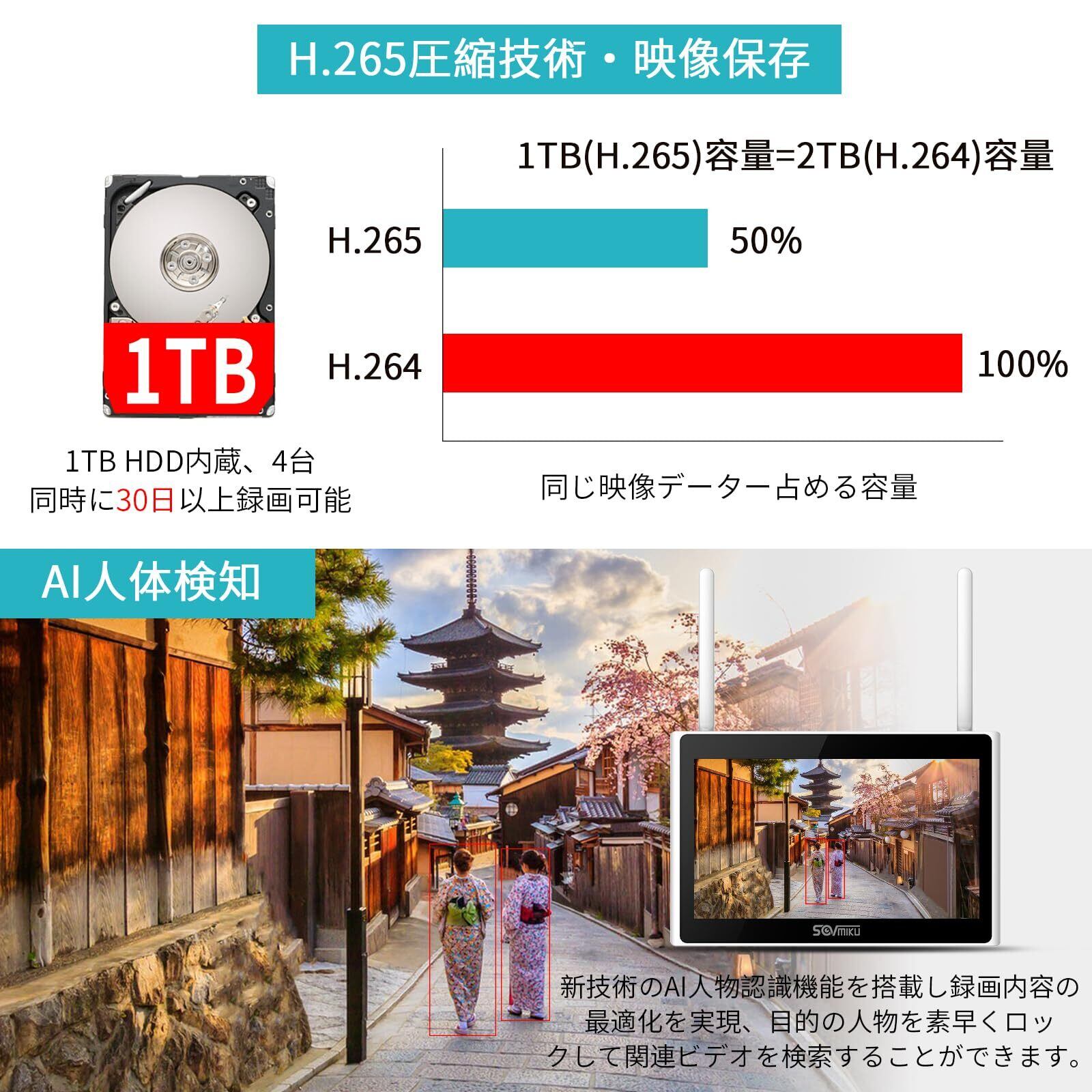 【双方向音声・1TB HDD内蔵】防犯カメラ ワイヤレスSovmiku 10インチ超 モニタ一体型NVR 1536P 500万画素ワイヤレスカメラ2台セット