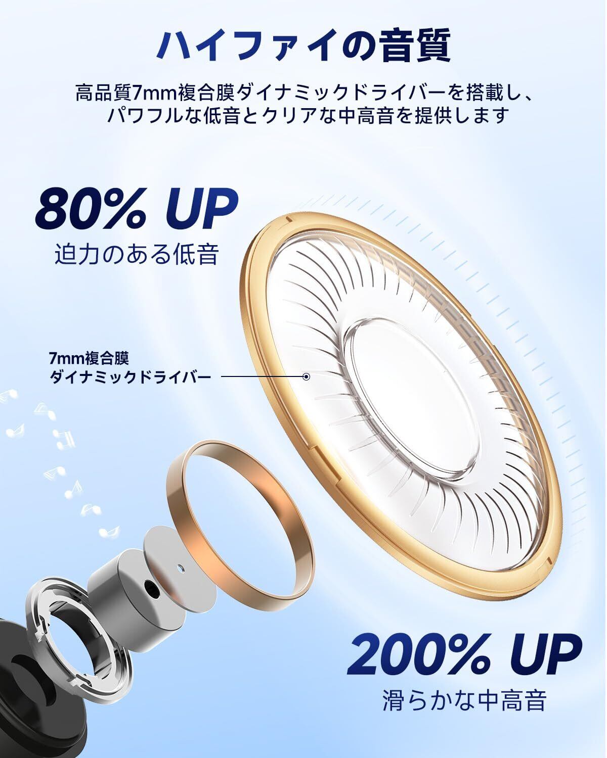 このワイヤレスイヤホンは、高音質な7mmグラフェンドライバーを採用しており、豊かな音質を誇ります。また、カスタムEQ機能を備えた専用アプリで、あなた好みの音質に調整できるため、あらゆる楽曲をより深く楽しむことができます。