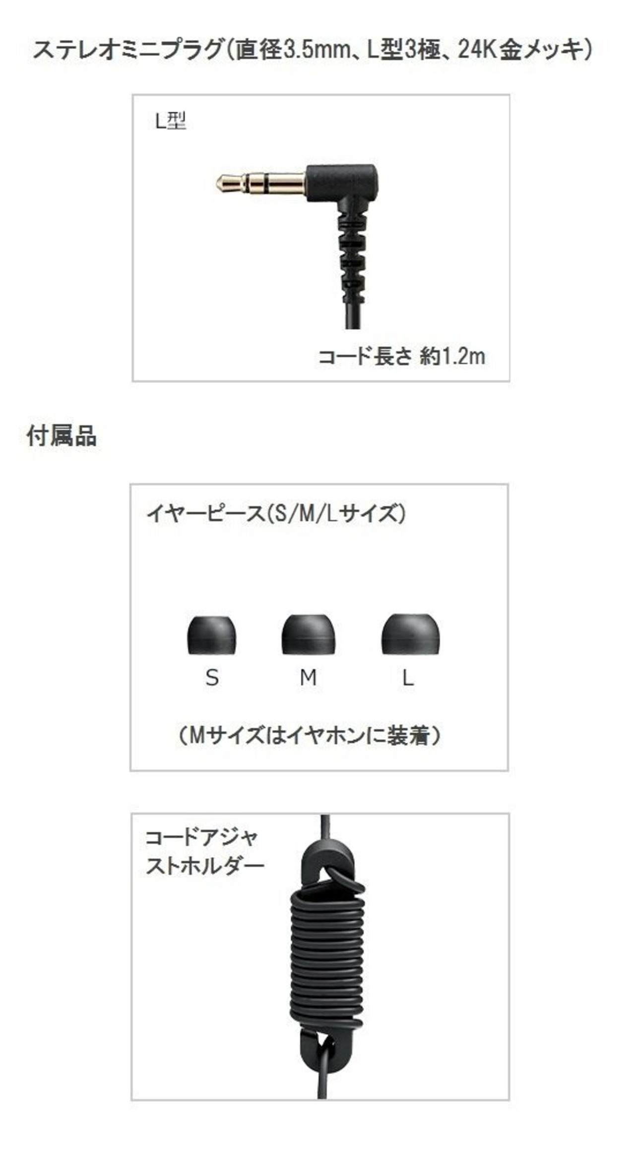 付属品:イヤーピース(S、M、L各2個)(Mはインサイドホンに装着)、コードアジャストホルダー