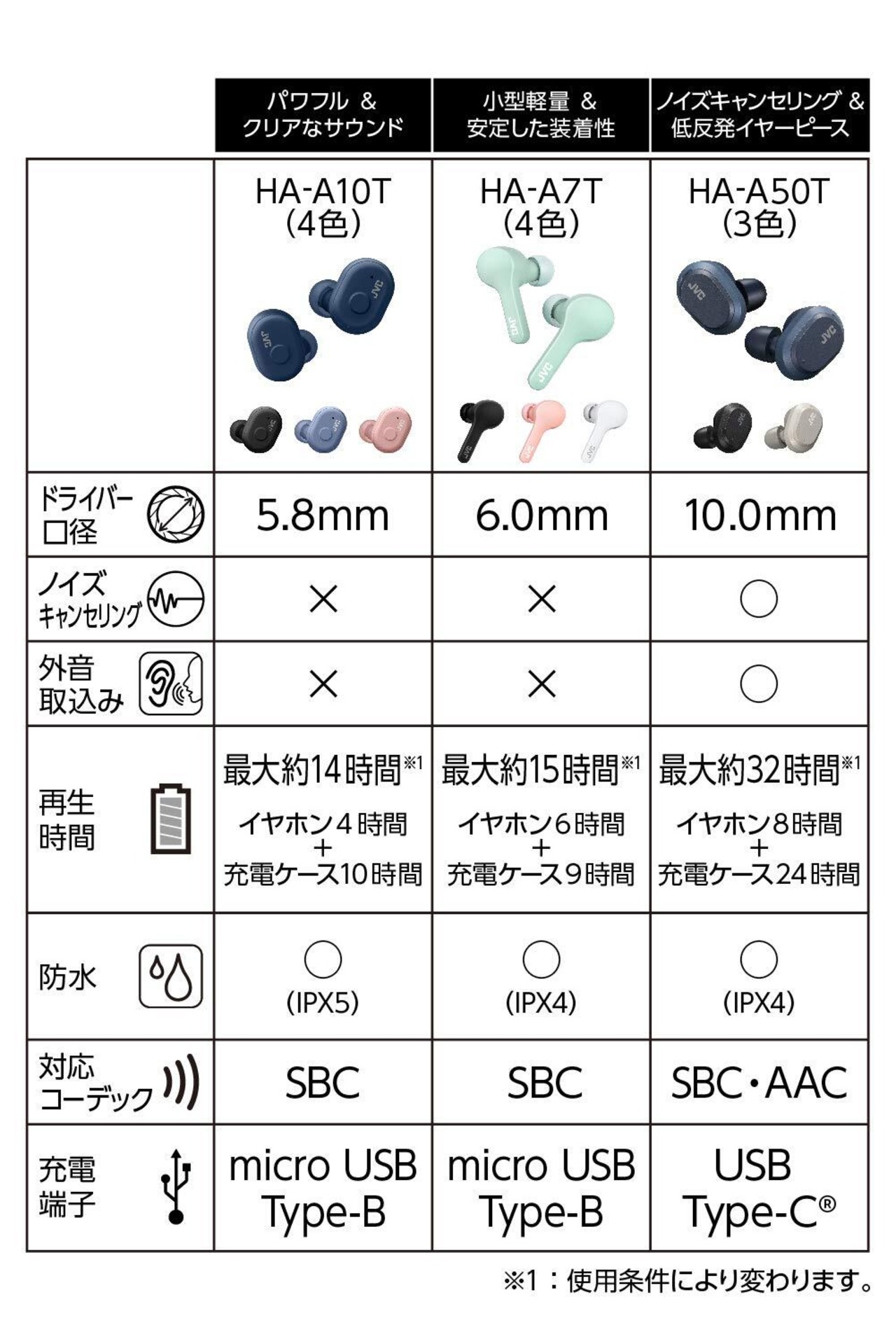 本体のみで約6時間※の連続再生と充電ケースでのフル充電(約6時間※×1.5回)により合計約15時間※の長時間再生が可能。また、15分の充電で約1時間※の連続再生が可能なクイック充電にも対応しています。※:使用条件により変わります。