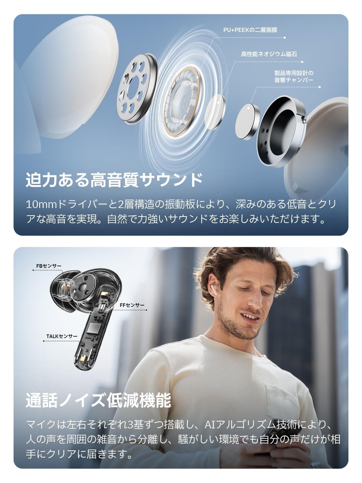 【進化を続ける、音と静寂のハーモニー】最先端のハイブリッドANC搭載し、最大-48dBのノイズ低減を実現。通勤、オフィス、家庭、旅行などのシーンで静かに音楽時間を楽しむことができます。外音取り込み機能を搭載で、イヤホンを外す必要がなく、会話、空港や駅のアナウンスもはっきりと聞き取れます。10mmドライバーと2層構造の振動板により、深みのある低音とクリアな高音を実現。自然で力強いサウンドをお楽しみいただけます。