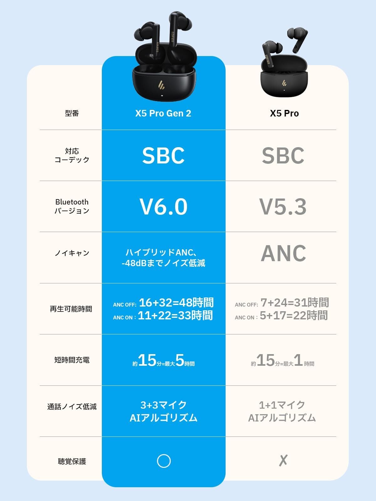 EDIFIER X5 pro Gen 2 ワイヤレスイヤホン アップグレード版 ハイブリッドANC搭載 -48dBまでノイズ低減 Bluetooth 6.0 急速充電 48時間再生 6マイクAI通話 空間オーディオ 聴覚保護 外音取り込み IP55防水 スマホ iPhone Android PC (ブラック)