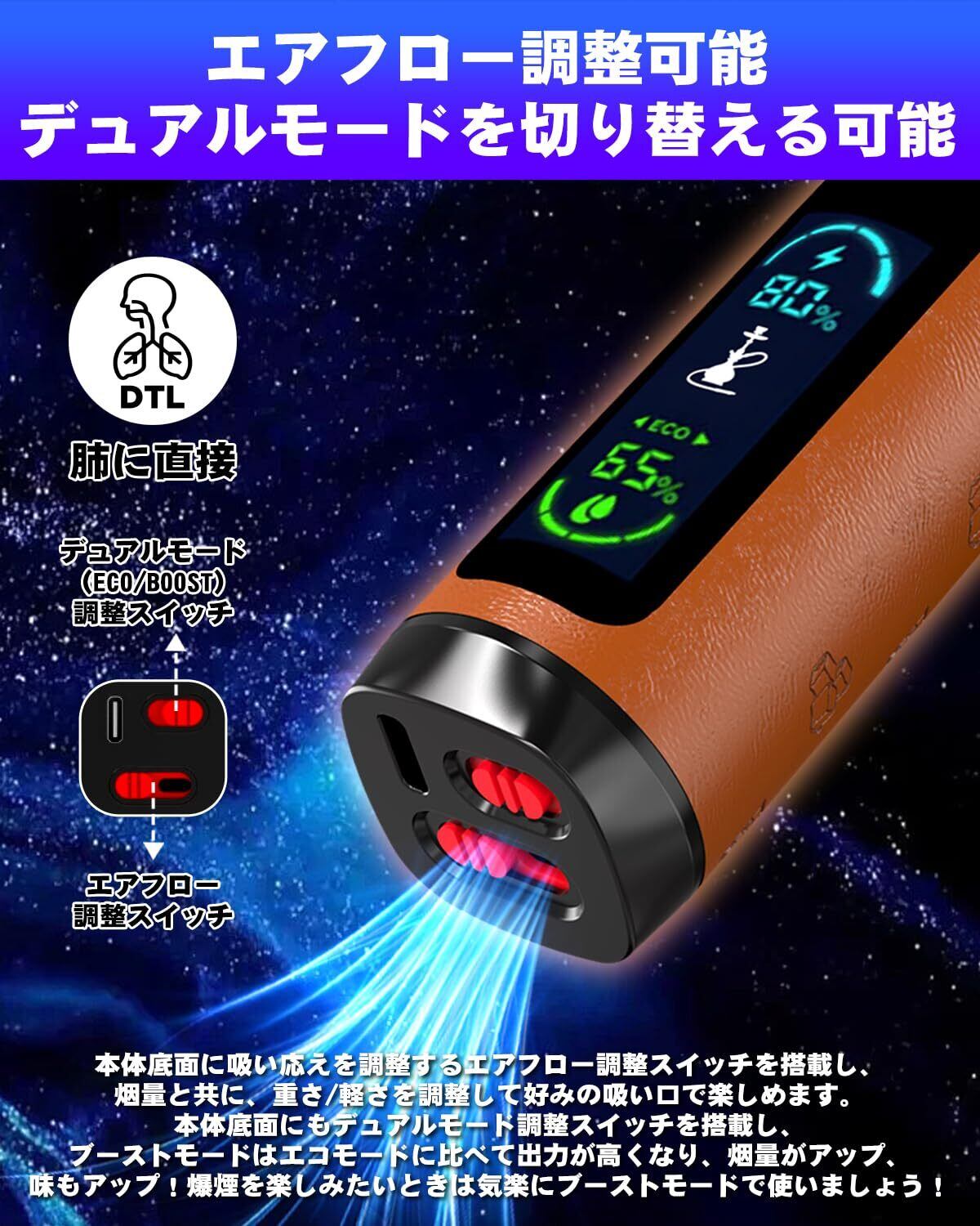 吸引スタイルに合わせてデュアルモードで調整が可能。自分の好みに合った吸い心地を選べる楽しさがあります。爆煙もお楽しみいただけますので、友人とのシェアタイムにも最適です。