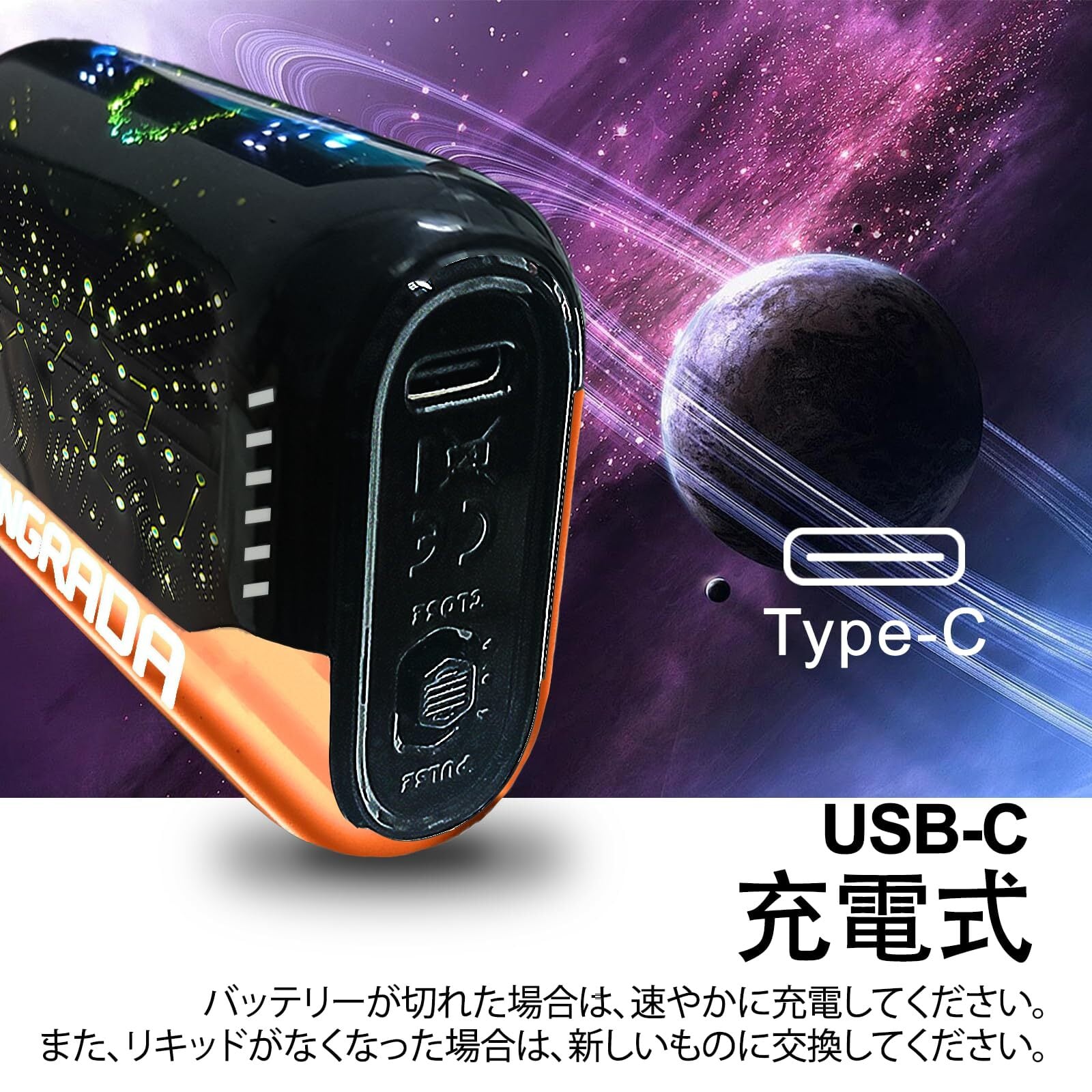 このVAPEは、ニコチンやタールを含まないため、禁煙を目指す方や健康を重視する方にも最適です。特許取得済みの特製リキッドはビタミンを含み、喫煙時の満足感を高め、毎日を楽しくサポートします。