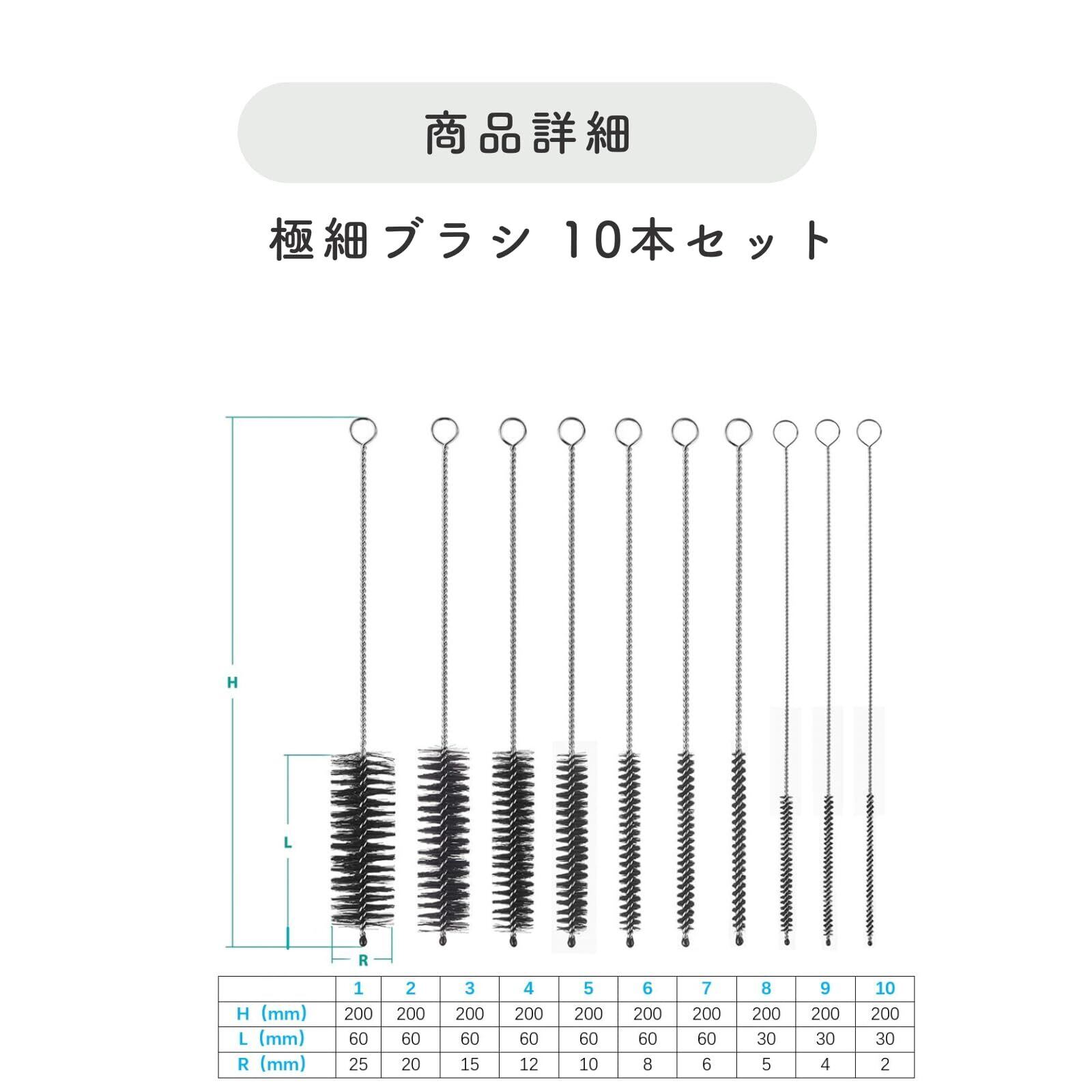 この極細ブラシ10本セットは、特に狭い隙間や細かな部分の掃除に最適です。試験管や排水口、エアコンのフィルターなど、手が届きにくい場所を効果的に清掃するために設計されています。安価な使い捨てブラシとは異なり、頑丈で長持ちするため、頻繁に使用する方にも満足していただける品質です。