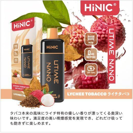 HiNIC UTIME NANOは、ライチタバコの濃厚な香りを存分に楽しめる電子タバコです。使い捨てタイプで、1200回の吸引が可能なため、いつでも手軽にフルーツの風味を味わうことができます。特別なひとときを演出する、あなたの新しい相棒です。