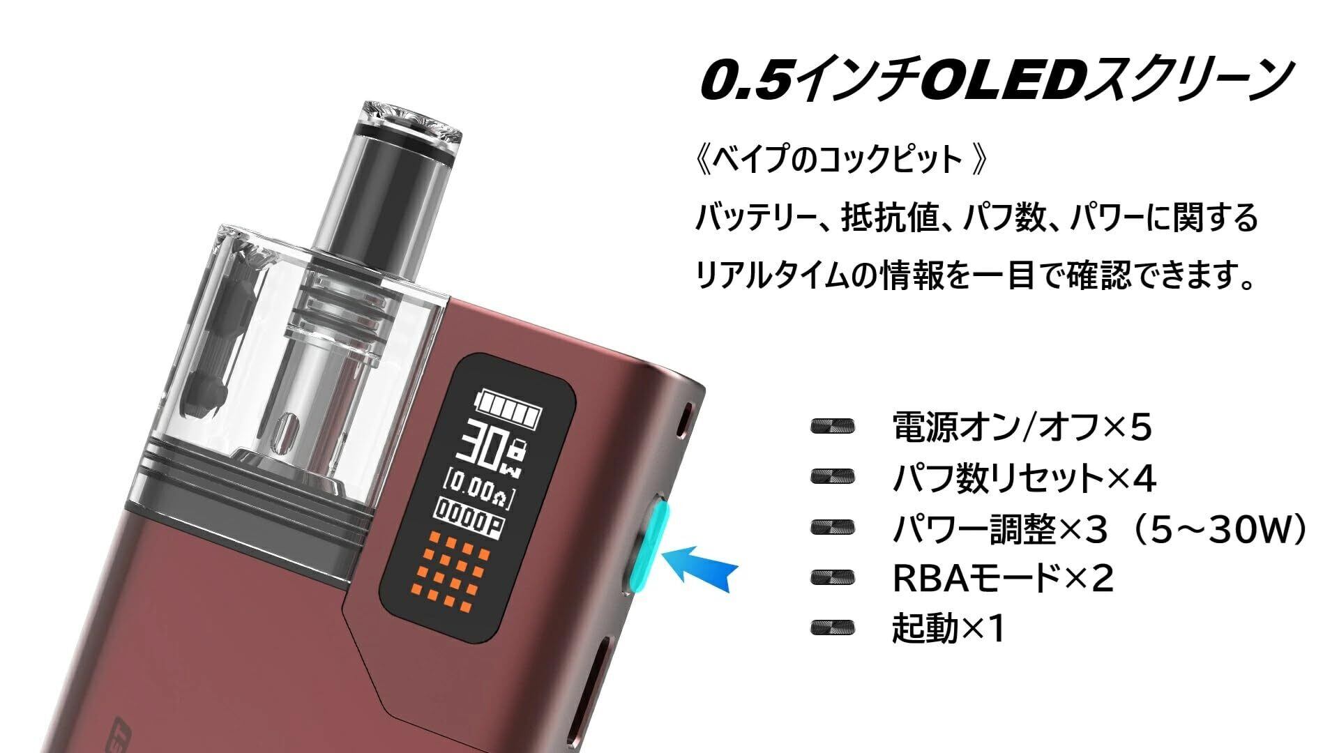 OLEDスクリーンには、バッテリーの状態、ワット数、抵抗、パフカウントが表示されます。