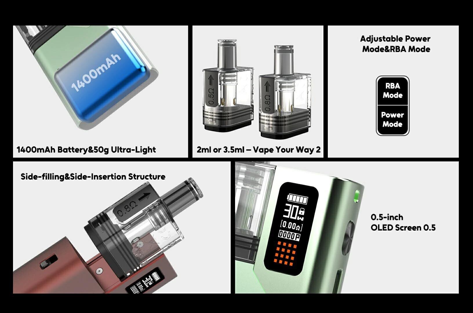 サイドフィル式の3.5ml漏れ防止カートリッジを備え、