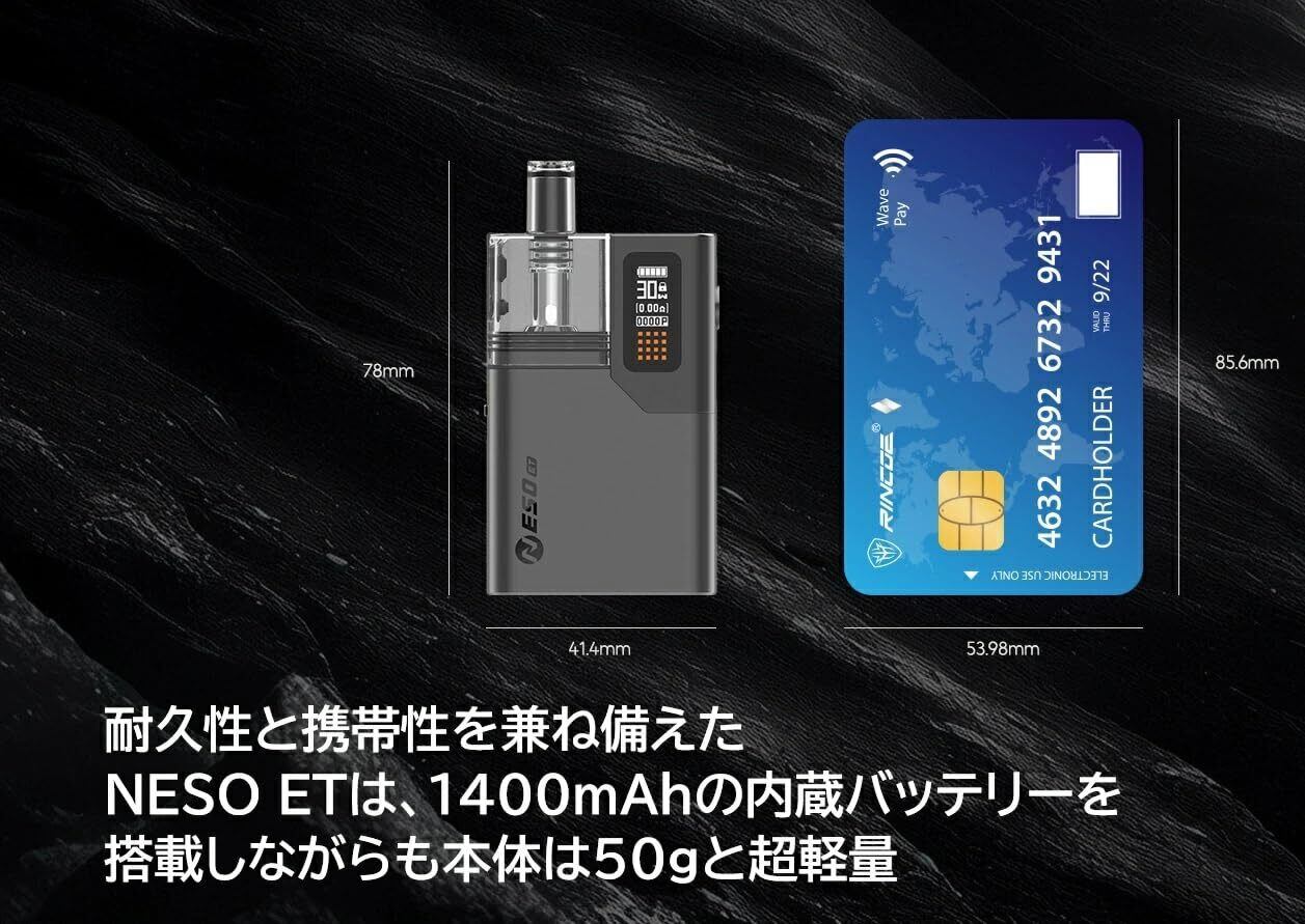 Rincoe Neso ETは、香り豊かなフレーバーを提供しつつ、口の中で広がる水蒸気のボリューム感が特長です。特別なハイテクノロジーを採用し、クリアな味わいを実現。これによって、まるで本物のシーシャを吸っているかのような満足感を得られます。