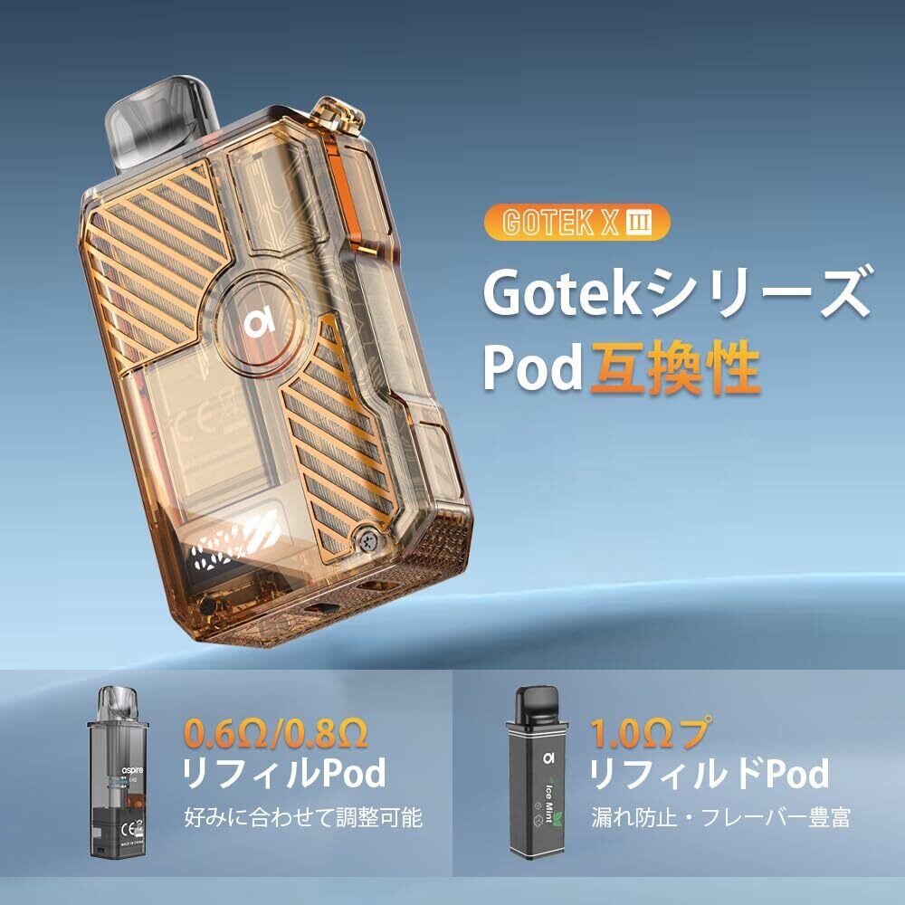 【規格&内容品】規格:〇82.3*47.4*21.6mm 内容品:〇アスパイア Gotek X III 本体×1〇アスパイア Gotek ポッド 0.6Ω (2ml)×1〇USB Type-C ケーブル×1〇ユーザーマニュアル×1点(※本商品はVAPE(電子タバコ)のスターターキットです。リキッドは付属しておりません。)