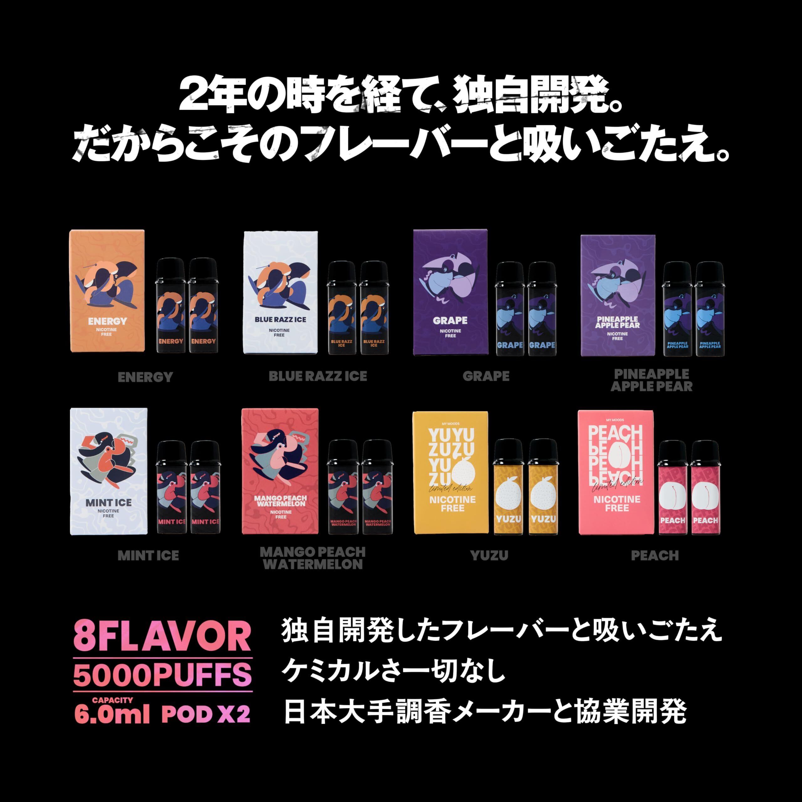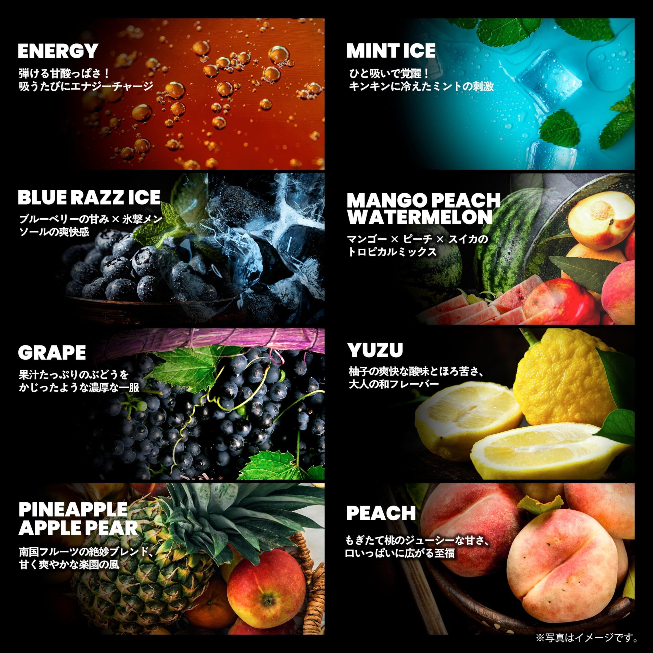 【味の濃さと本格的なフレーバー】芳醇な旨味のフルーツ系、爽やかに風味が突き抜けるミント系、活力あふれるエナジー系など。あらゆるシーンに寄り添う、充実の8フレーバー。
