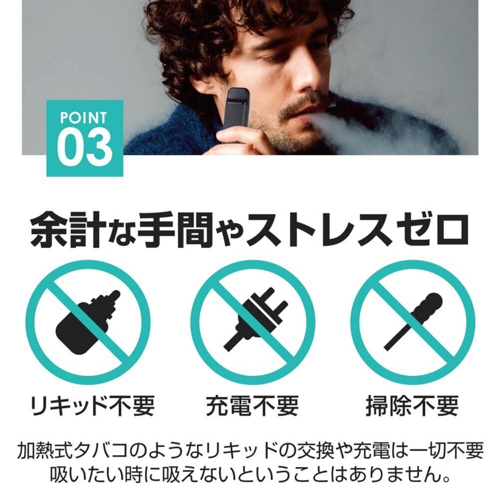【余計な手間やストレスゼロ】リキッド追加、充電、掃除。全部不要!加熱式タバコのようなリキッドの交換や充電は一切不要。吸いたいときに直ぐ喫煙可能です。ボタン操作も一切なし 吸う動作だけで起動してくれて吸い殻もナシ。軽量かつコンパクトなのでポケットに収納したり、持ち運びにも便利です。