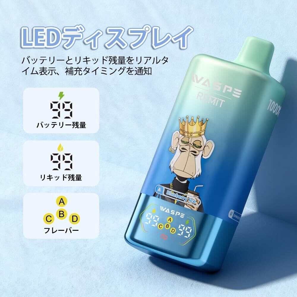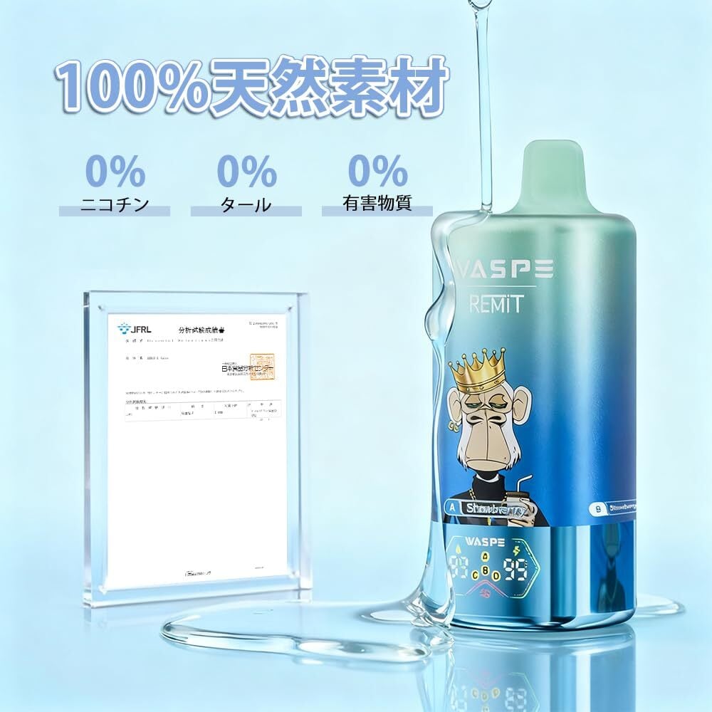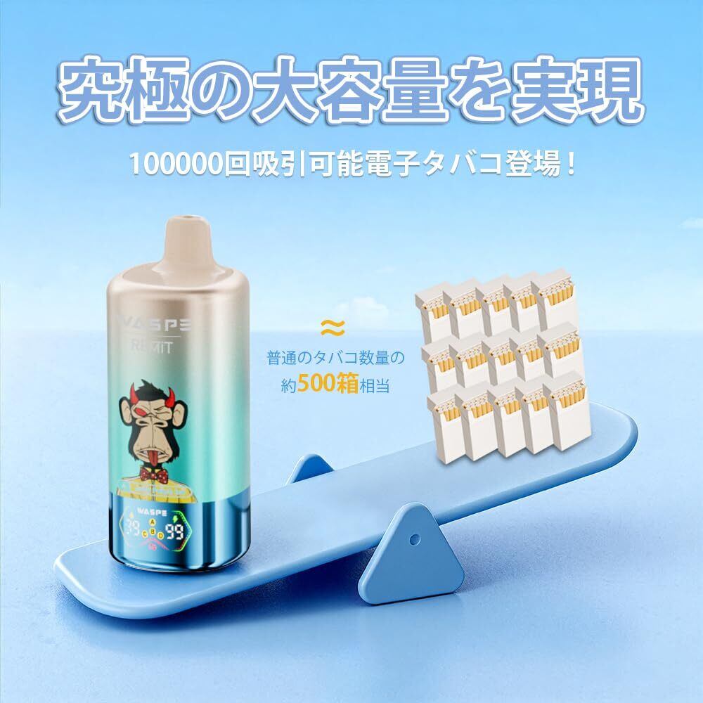 WASPE 100000は、なんと100,000パフの長寿命を誇る電子タバコです。豊富な2種類のデュアルメッシュコイルと高品質リキッドを使用し、ストロベリー・バナナやレッド・ブルなど、まさにフルーティーな体験を提供します。健康志向の方にも嬉しい、ニコチンとタールを含まないので安心して楽しめます。
