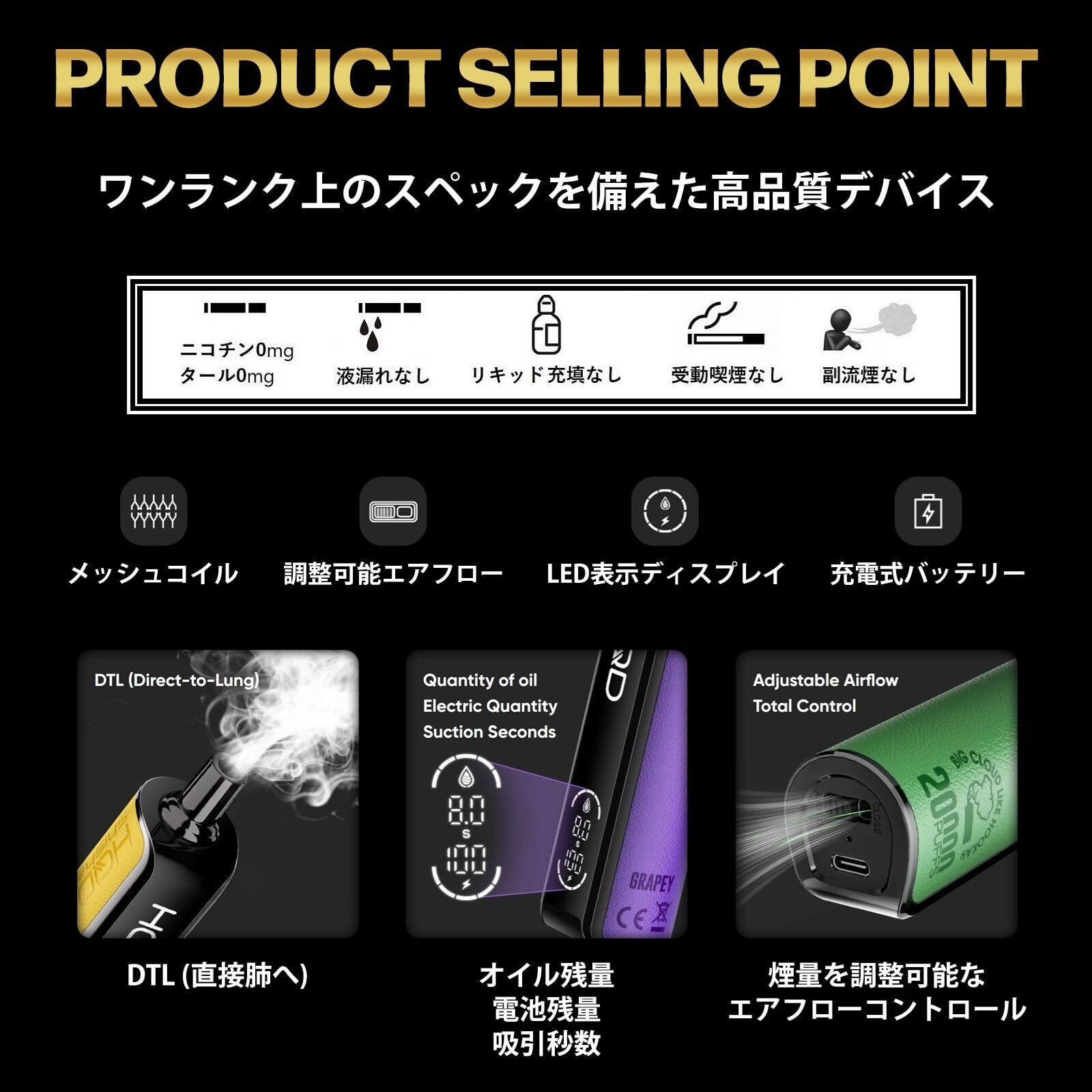 【Type-C充電機能&充電長持ち】全てのリキッドを吸い終えるまで数回は充電して使用しますが、バッテリーは850mAhの大容量で1回のフル充電でも相当長持ちします。最大20000回の使用回数を最後まで快適に楽しめるプロスペック仕様になっています。【Type-Cケーブル付き】