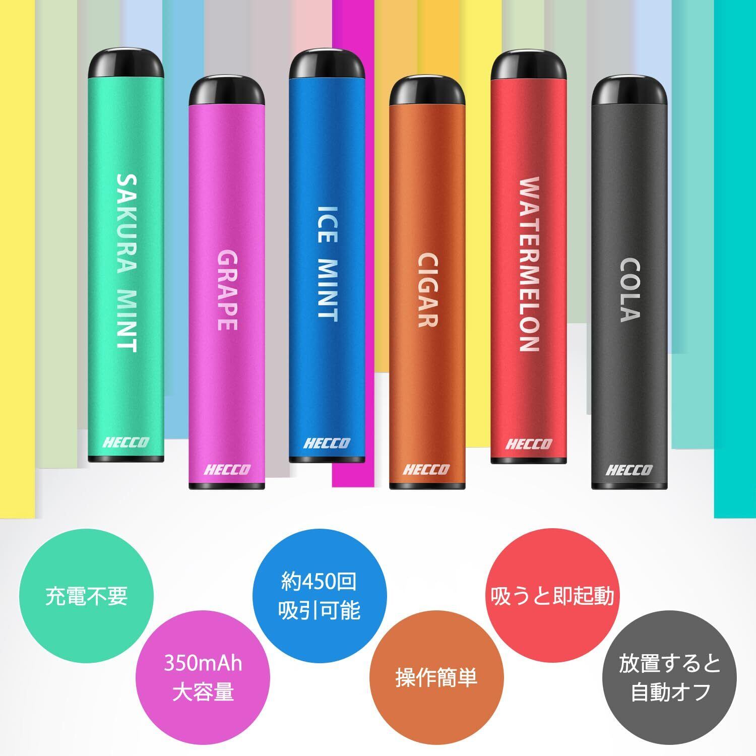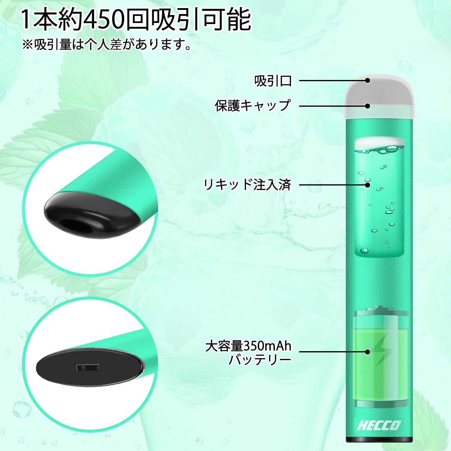 コスパ抜群:1本で約450回の吸引ができます。タバコに換算すると約3箱分になります。1箱で「450回 x 2本= 900回分」ができるコスパの良さ(吸引回数は参考値であり、個人差、個体差がございます。1口を吸う時間の長さなどによって吸う回数は前後します。)健康面だけでなく、経済的な面でもお得です。使い切り(※1)なので使い切ったらそのまま燃えないゴミへ処分できます。