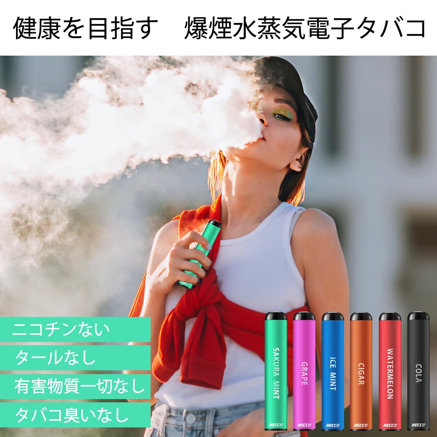 タール・ニコチンなしでたばこの様な害がない。ミスト/水蒸気なので、たばこの煙のような匂いは全くありません。車内や室内で吸引しても匂いが残らないので、ご安心ください。