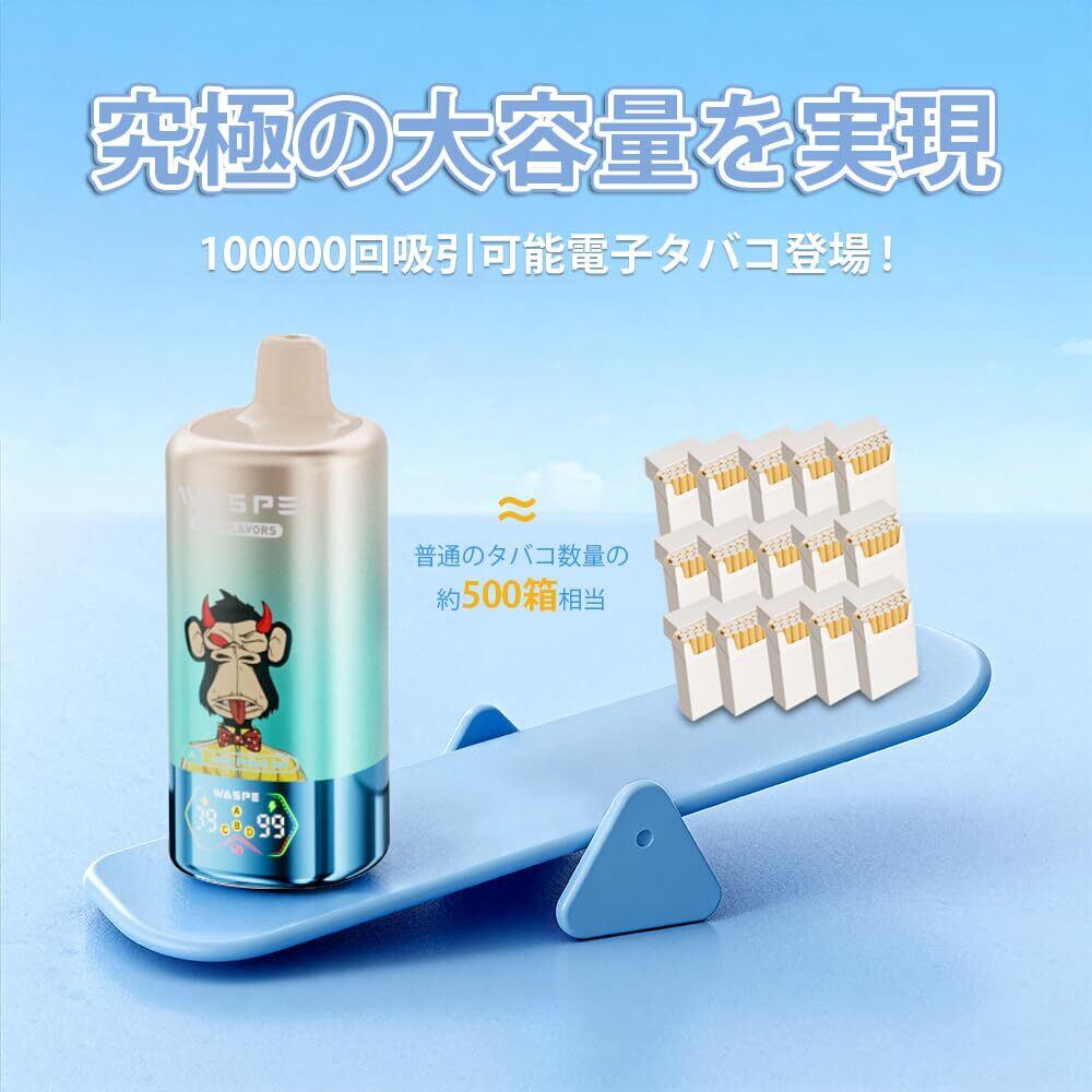 使い捨て電子タバコで大人気ブランドWASPEシリーズの最新WASPE 4-in-1 100000が登場!さらに多くのフレーバーとパフ数を増加し、4つのフレーバーを一台で楽しめます。持ち運びシーシャの四重メッシュコイルにより、スムーズな蒸気と豊かなフレーバーを実現します。650mAhのバッテリーはType-C急速充電に対応し、長時間に使用可能です。スマートLEDディスプレイで、バッテリー残量をリアルタイムで確認できます。初心者でも簡単に使える水蒸気タバコです。