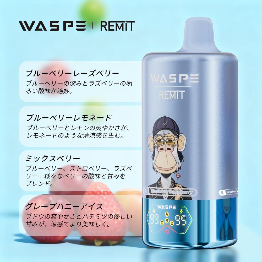 Remit & WASPE 4in1は、ブルーベリーラズベリー、ブルーベリーレモネード、ミックスベリー、グレープハニーアイスの4種類の人気フレーバーが楽しめる電子タバコです。100,000回の吸引が可能という驚異的な性能により、長時間にわたってリッチな味わいを堪能できます。ニコチン・タールゼロで、健康を気遣う方にもおすすめです。