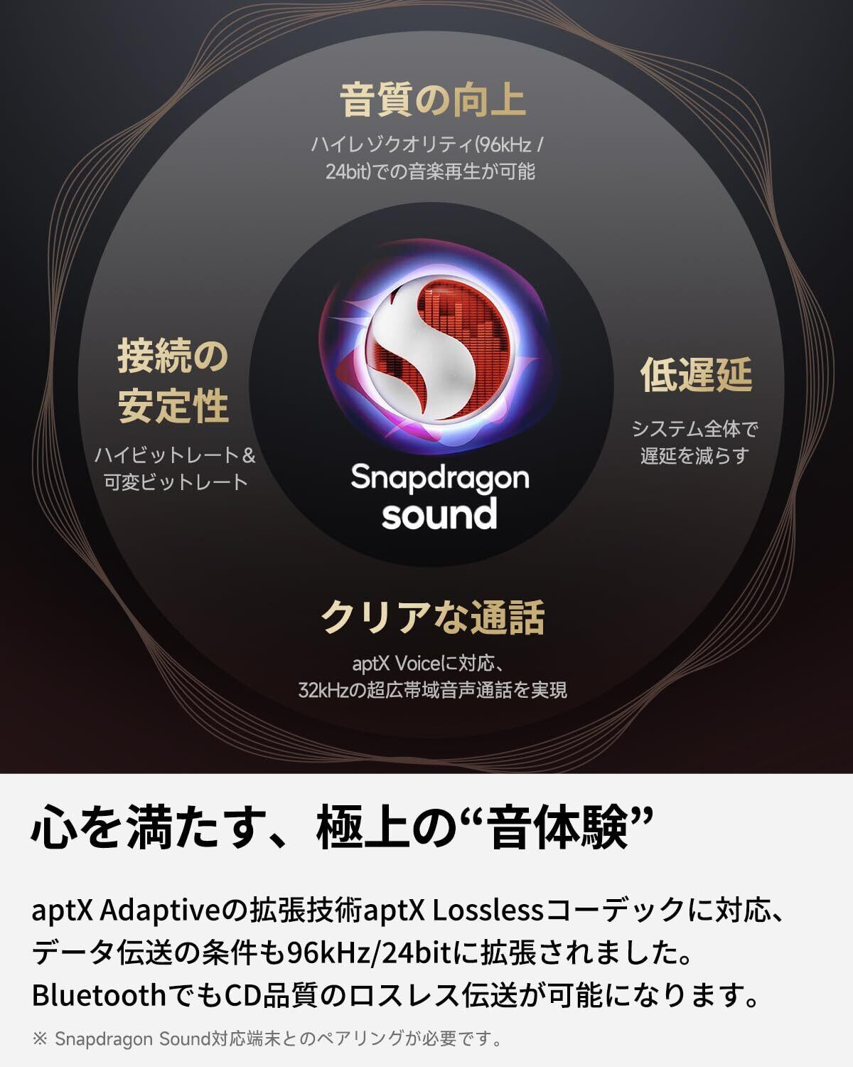 【音質最優先!CDを越えるロスレス・ワイヤレス体験】最新で最高峰の技術ソリューションであるプラットフォームQualcomm Snapdragon Soundに対応しました。「音質」や「接続の安定性」や「遅延」や「通話品質」など、オーディオに重要な各性能を向上させます。通信状態に応じてビットレートを自動調整するコーデック「aptX Adaptive」に対応し、状況に応じ最適なオーディオ体験が可能になるほか、最大96kHz/24bitというハイレゾ相当のデータレートも伝送できます。加えて、ロスレスコーデック「aptX Lossless」もサポートし、CD品質の44.1kHz/16bitロスレス再生を実現しました。音楽や動画、ゲームなどあらゆるソースとシチュエーションで、プレミアムなサウンドを体験いただけます。 Snapdragon Sound対応端末とのペアリングが必要です。