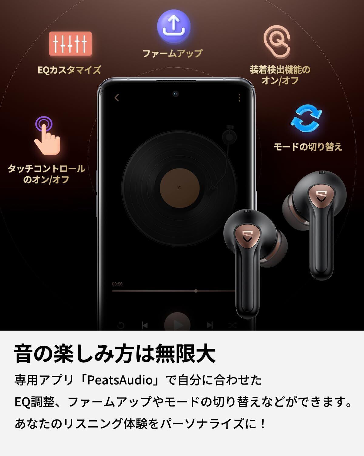 【最新実用機能全部入り、音の楽しみ方は無限大】「マルチポイント接続」Bluetoothのマルチポイント接続に対応、1台のAir4 Proを2台の親機(トランスミッター/送信側)と同時接続できます。パソコンとスマートフォンを利用しているとき、両方に接続していれば、突然パソコン側でビデオ会議が始まったとしても、スマートフォン側の音楽再生を停止しパソコンにつなぎ替える必要はありません。「専用アプリ対応」アプリ「PeatsAudio」に対応し、イヤホンのステータス表示や設定変更ができます。アプリに10バンドEQ機能を搭載しており、低音や高音を強調/抑制したり、プリセットのサウンドモードを選択したりすることで、リスナー最適化したリスニング環境を提供します。
