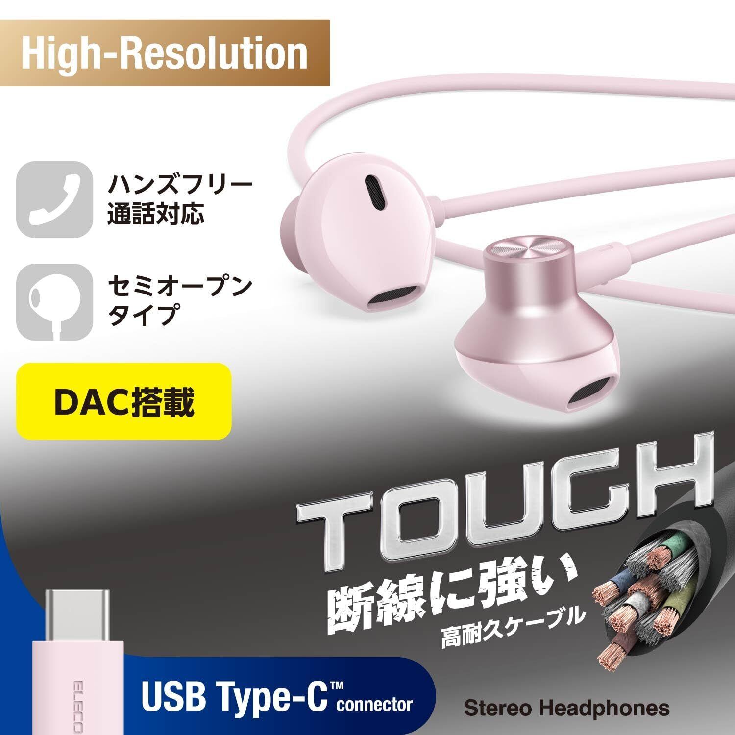 エレコム イヤホン Type-C 有線 インナーイヤー (セミオープン) 高耐久ケーブル 断線しにくい 音声と映像のズレなし 【再生/音量調整コントローラー付き】 [ iPhone 16e / 16シリーズ 対応 ] ピンク EHP-DF13IMPN