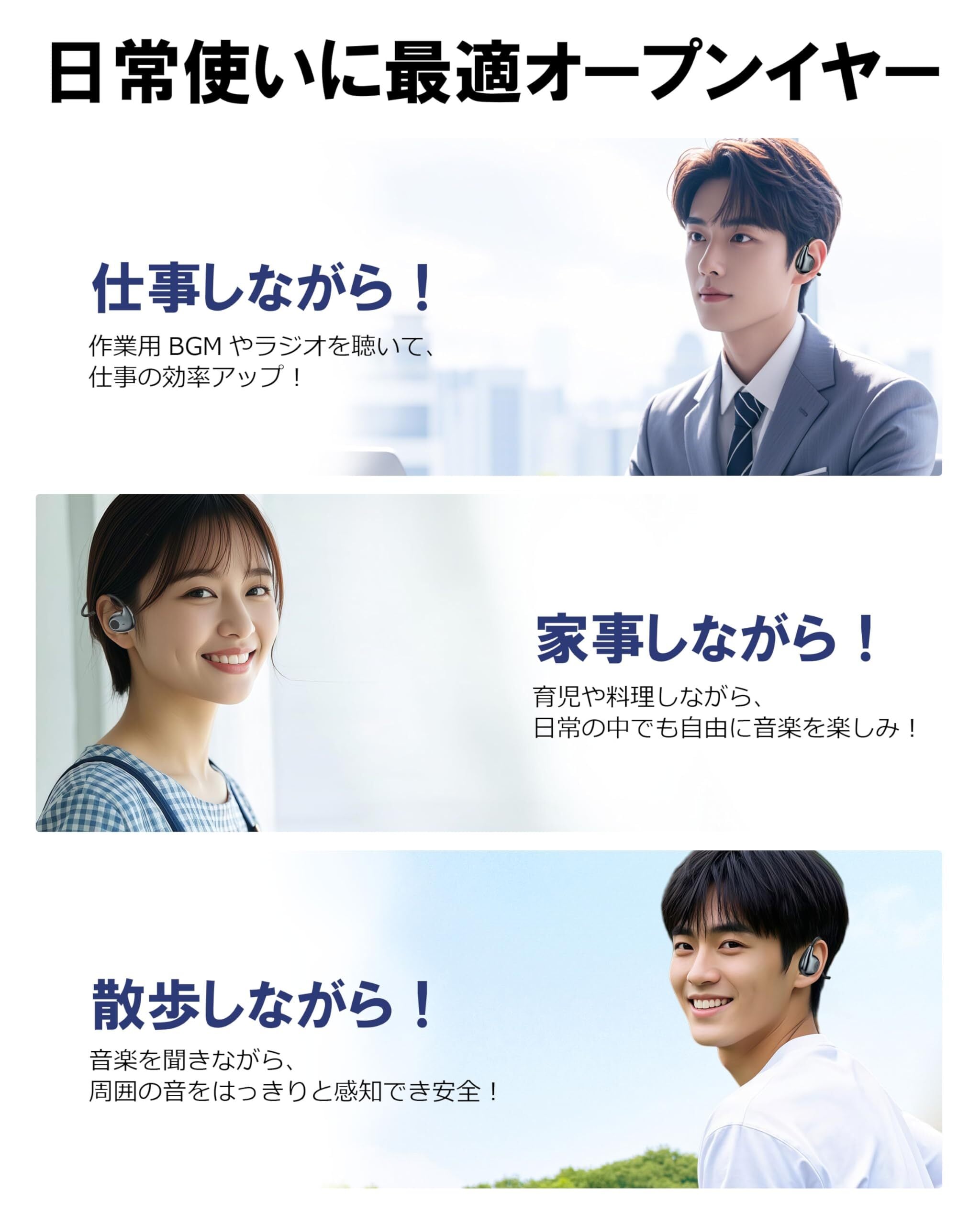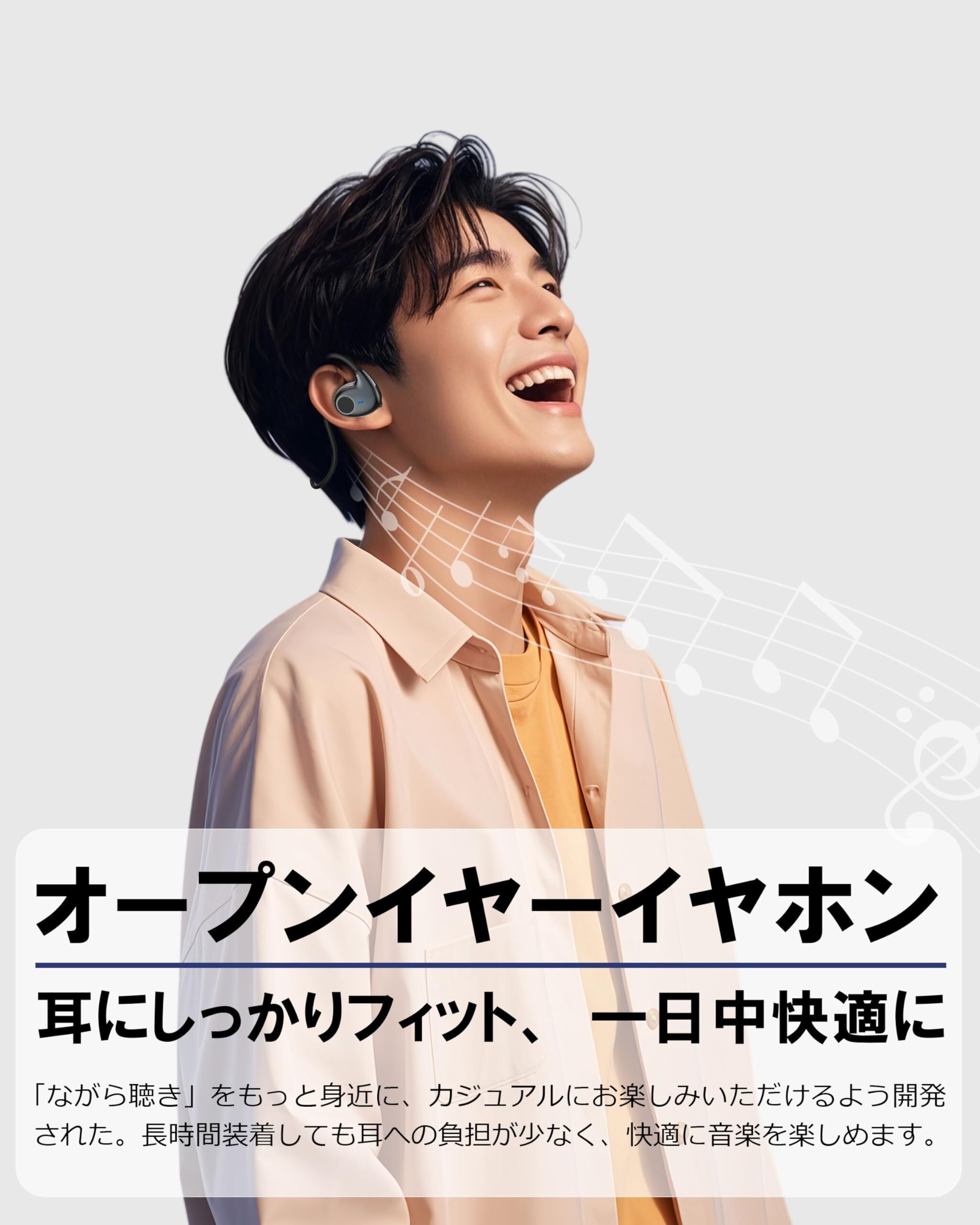 耳を遮ることなく、外部の音も意識しながら音楽を楽しむことができます。軽量設計(約9g)で、耳への負担を最小限に抑え、運動中や通勤時でも快適な使用感を提供します。