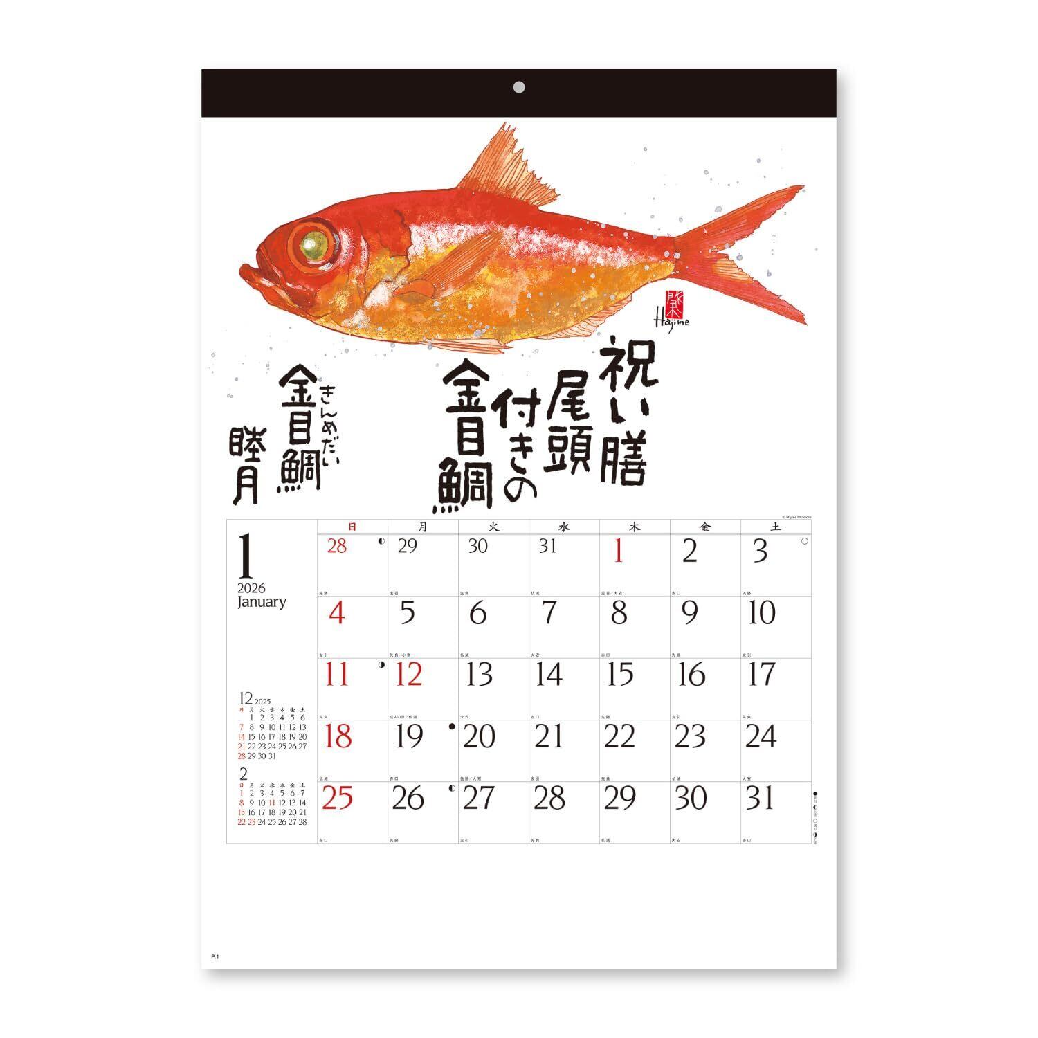 この壁掛けカレンダーは、岡本肇による鮮やかな魚のアートが特長です。しっかりとしたサイズ感で、どんな空間にも映えるデザインが魅力!毎月異なる美しい魚の絵柄が日々のインスピレーションを与えてくれます。