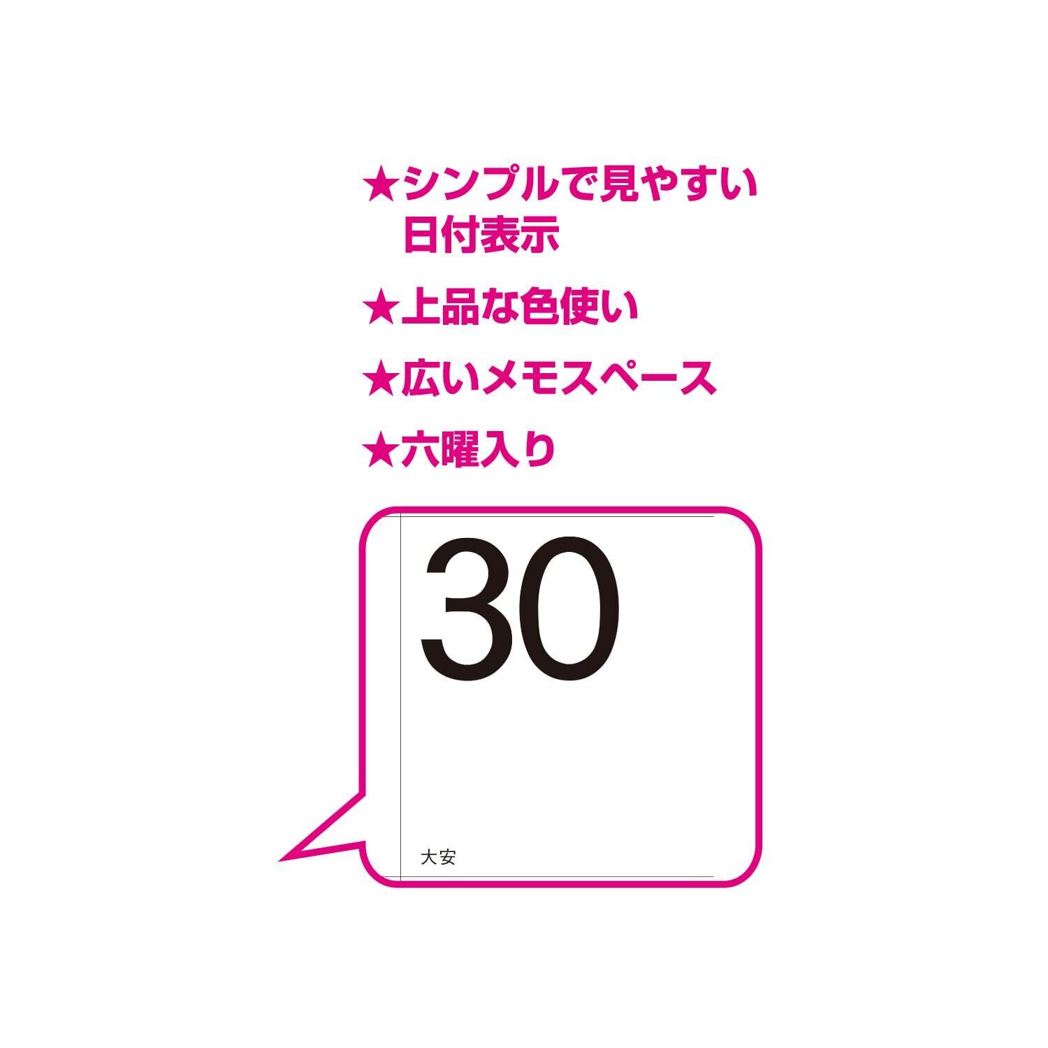 シンプルで美しい書体を採用し、上品にまとめました。広いメモスペースと6週表示で書き込みがしやすい仕様になっています。暦情報は六曜のみで、すっきりした印象を持ったカレンダーです。金具製本から紙製本に変更になりました。