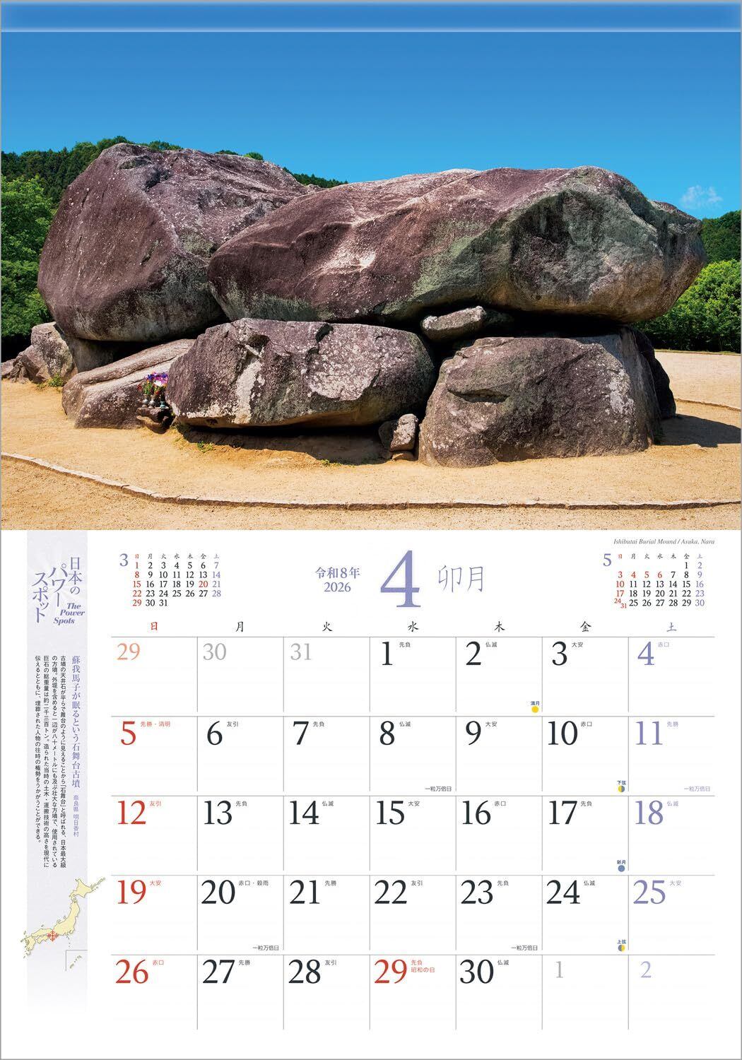 このカレンダーでは、蘇我馬子が眠るという石舞台古墳(奈良県)、高千穂峡の真名井の滝(宮崎県)など12箇所を厳選しました。