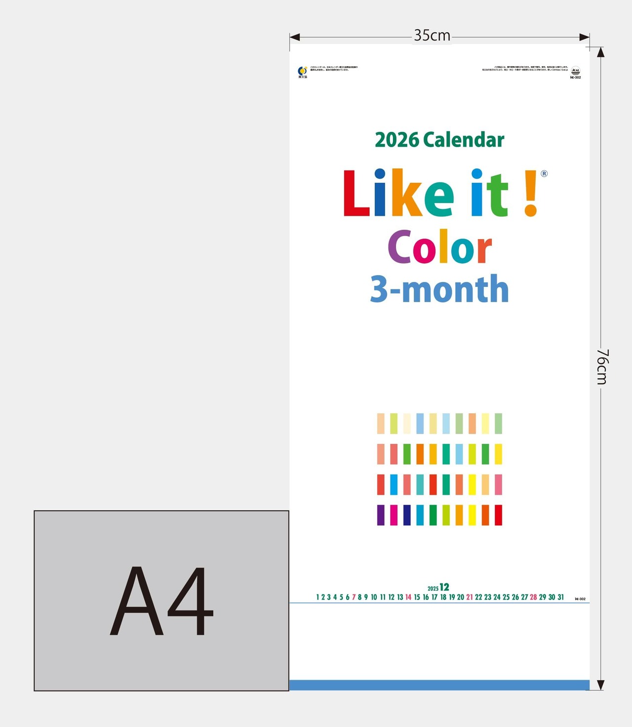 壁掛けカレンダー 2026年版 Like it Color 3ヶ月カレンダー 毎月切り取り ミシン目 メモスペース IC-302