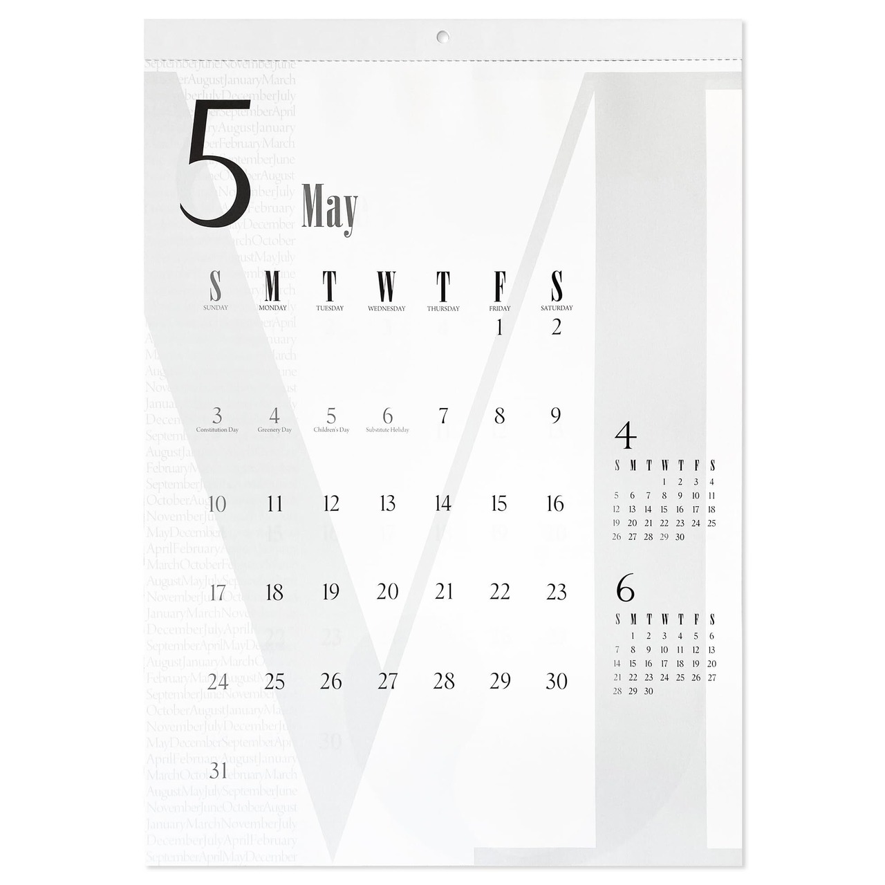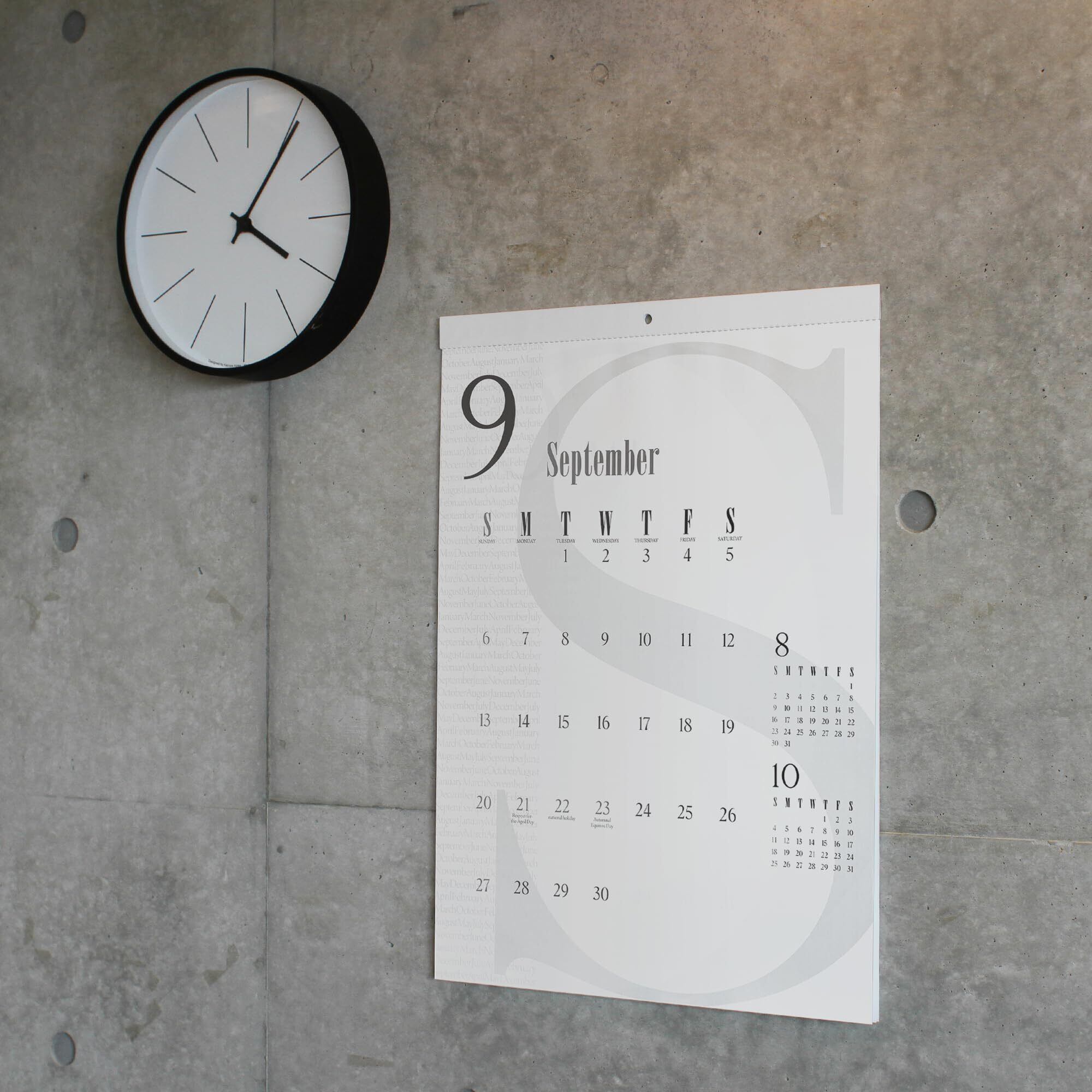 【随所にデザインが施されたカレンダー】 モノトーンのシンプルなデザインカレンダーですが、随所にデザインが施されています。 左端に小さな透かし文字のデザインと、月のアルファベットの頭文字がカレンダー全体に大きく配置されており、月ごとに違った表情を見せてくれます。