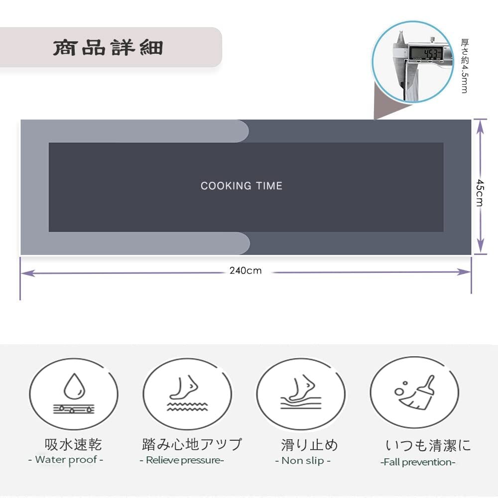 キッチンマット 240キッチンマット 拭ける 洗える床暖房対応 床保護マット吸水速乾防汚 台所 マット フロアマット 滑り止め加工 ずれない 転倒防止 クッション性 お手入れ簡単 44x240cm | kki