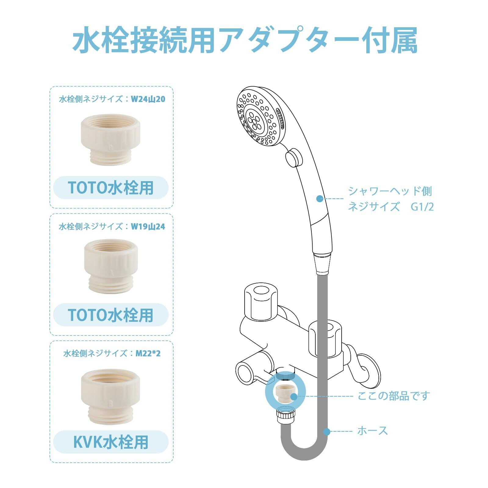 OFFO シャワーヘッド ホース付き 高水圧対応 シャワーホースアダプター付属 水流調整 手元止水 増圧シャワー 肌洗浄 漏れ防止 取付簡単 クロムメッキ仕上げ 日本語説明書付