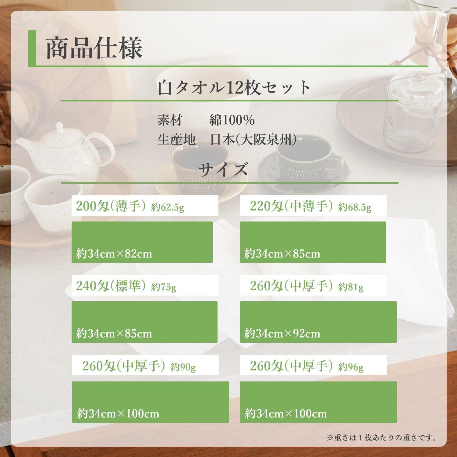 泉州タオル(Sensyu Towel) 使いやすい普通の白タオル 12枚セット 中薄手 日本製 フェイスタオル 220匁 綿100% 業務用 飲食店 美容院 銭湯 まとめ買い