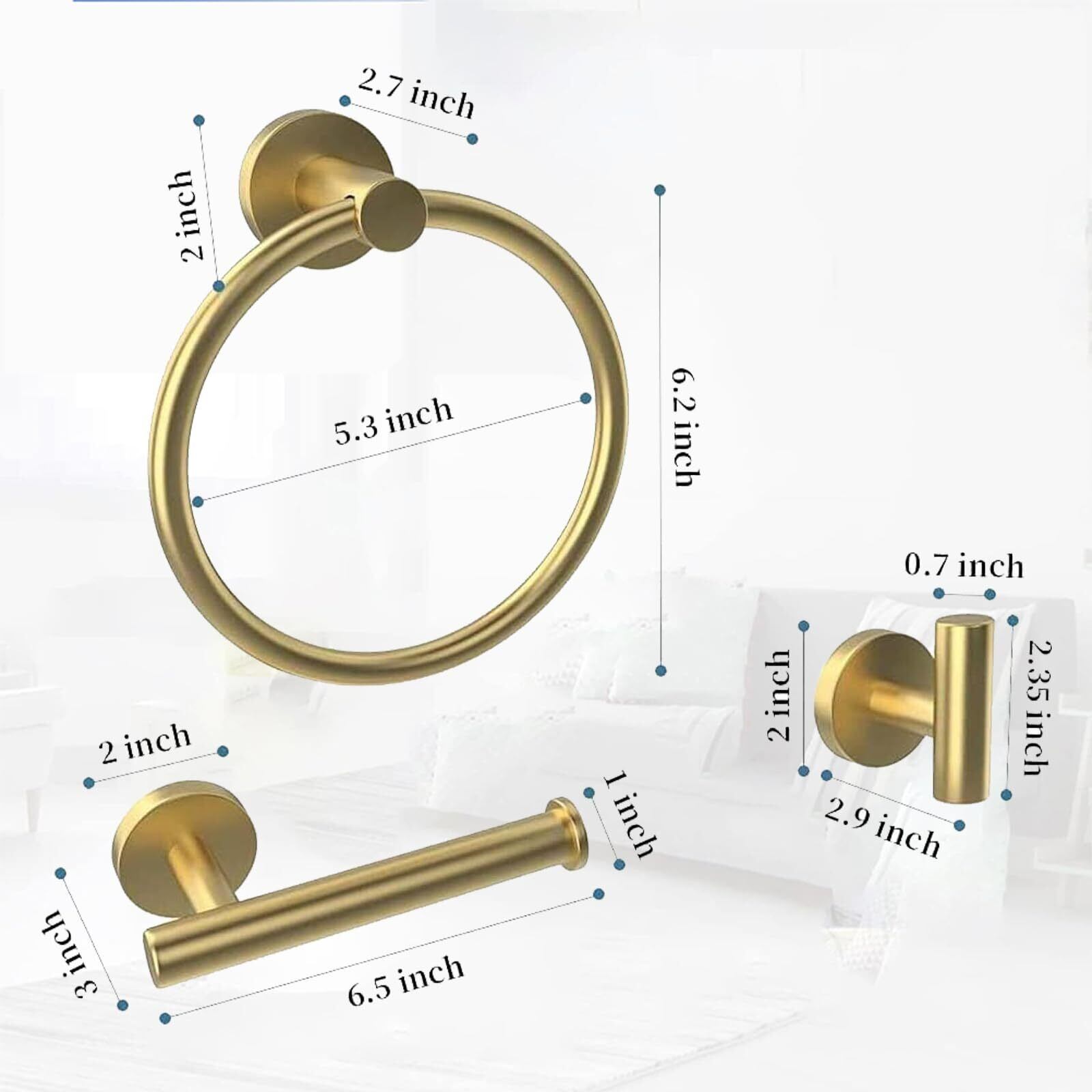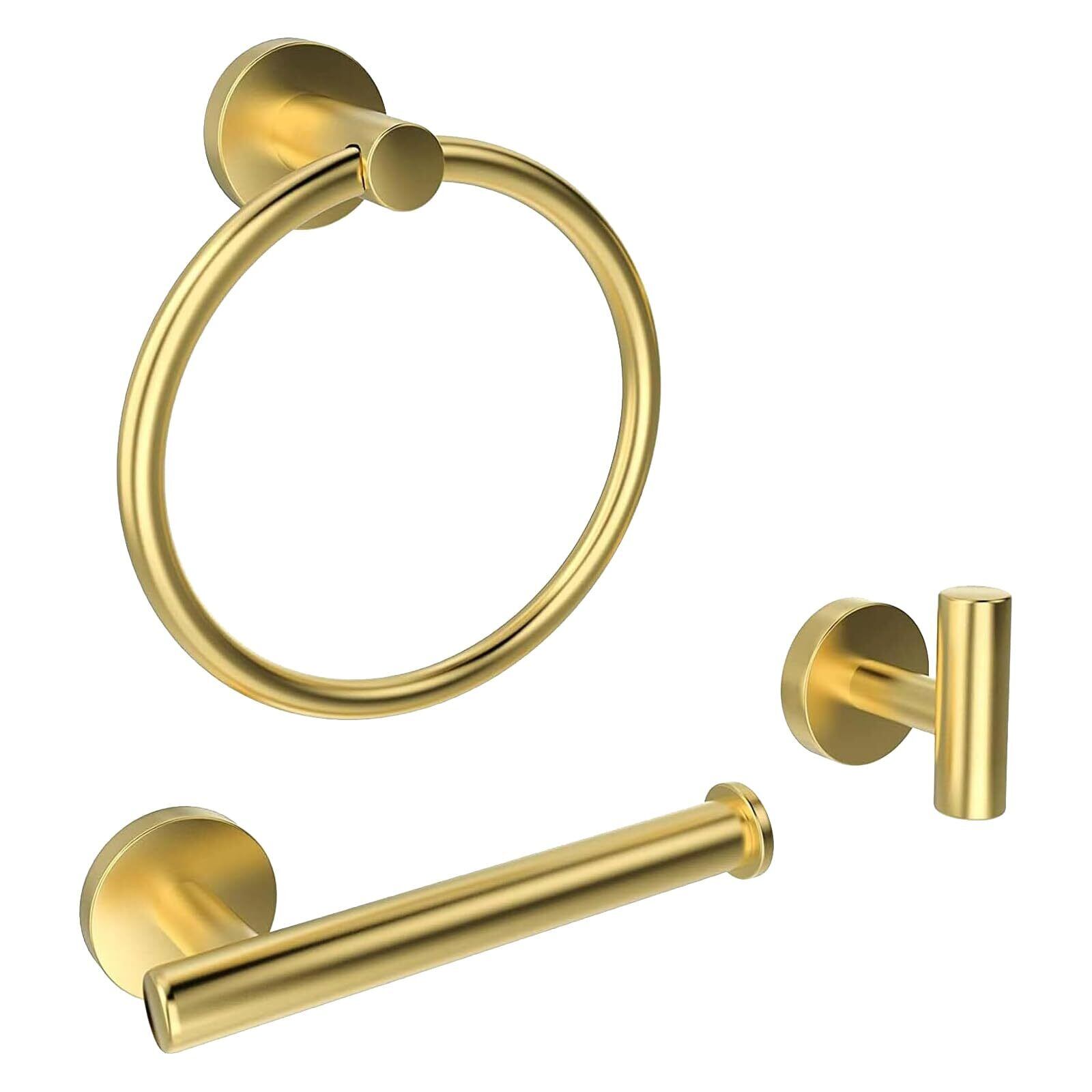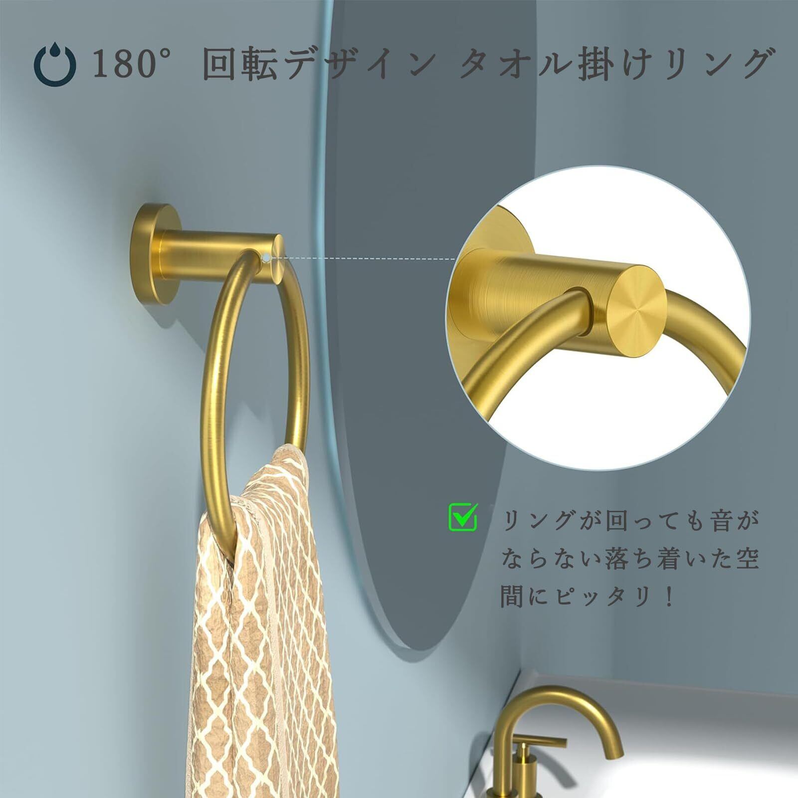 3点セット おしゃれ ステンレス トイレットペーパーホルダー タオルリング タオルフック 壁掛けフック タオルハンガー ビス止め キッチン 洗面所 トイレ 浴室 壁掛け バスルームアクセサリー ゴールド ネジ付き【セット買い】 (3点セット-タオルリング-ゴールド) | kki