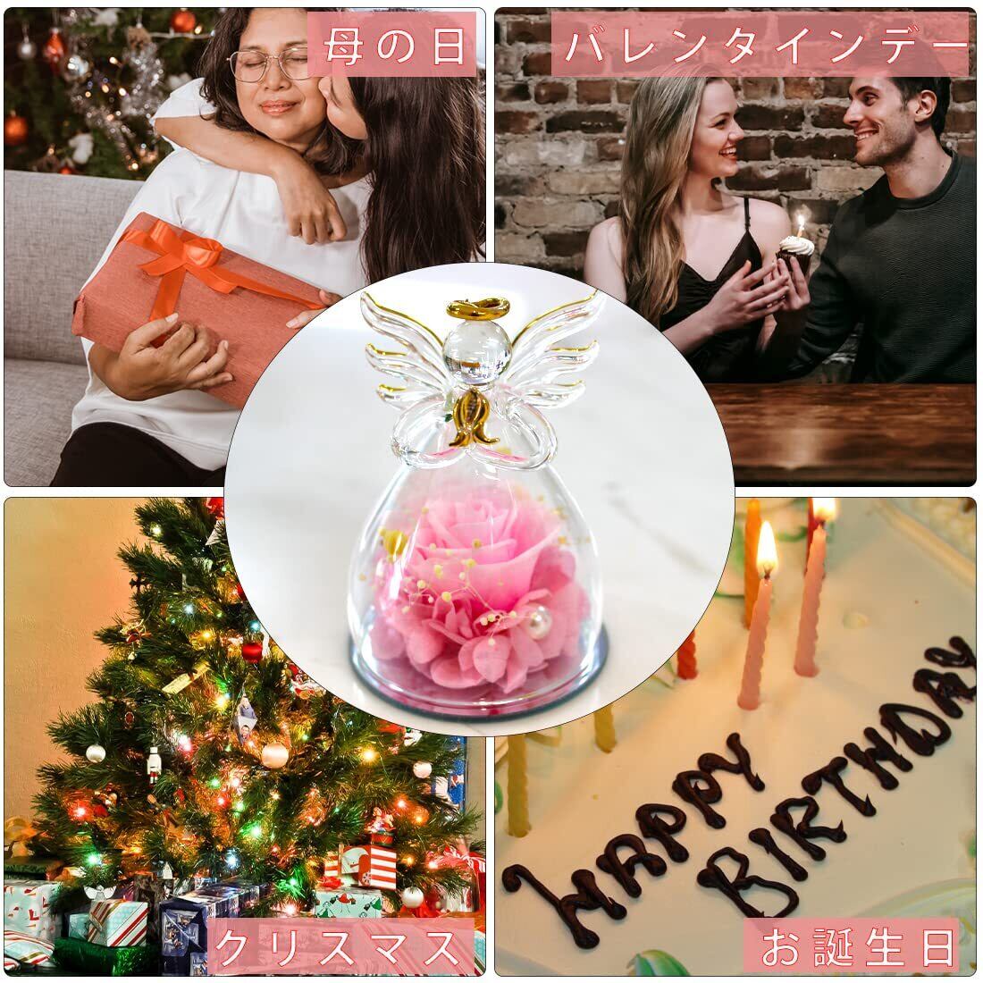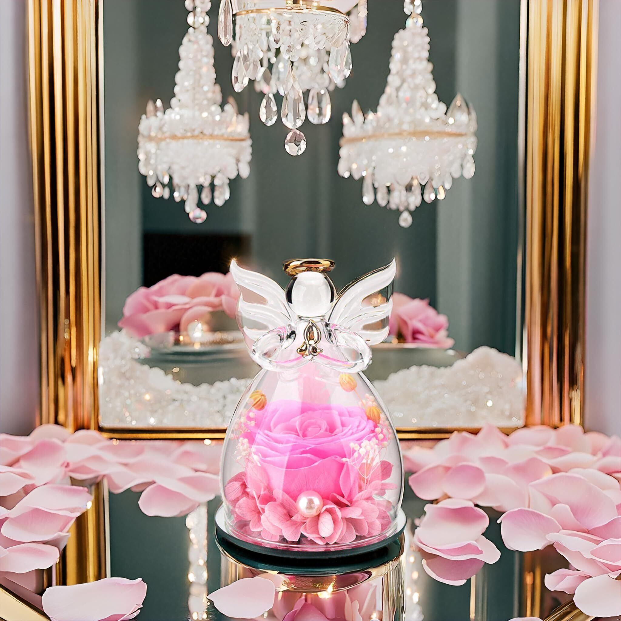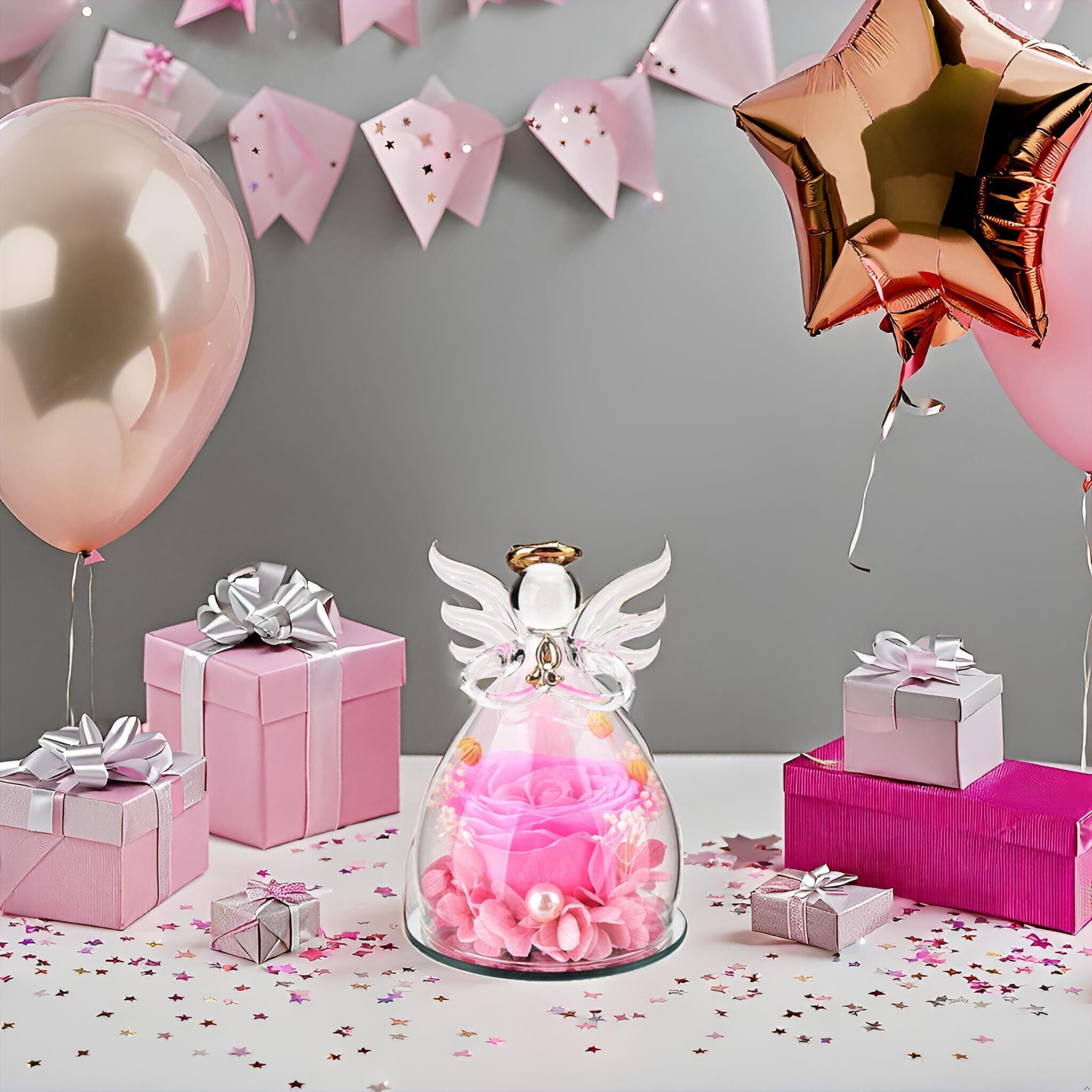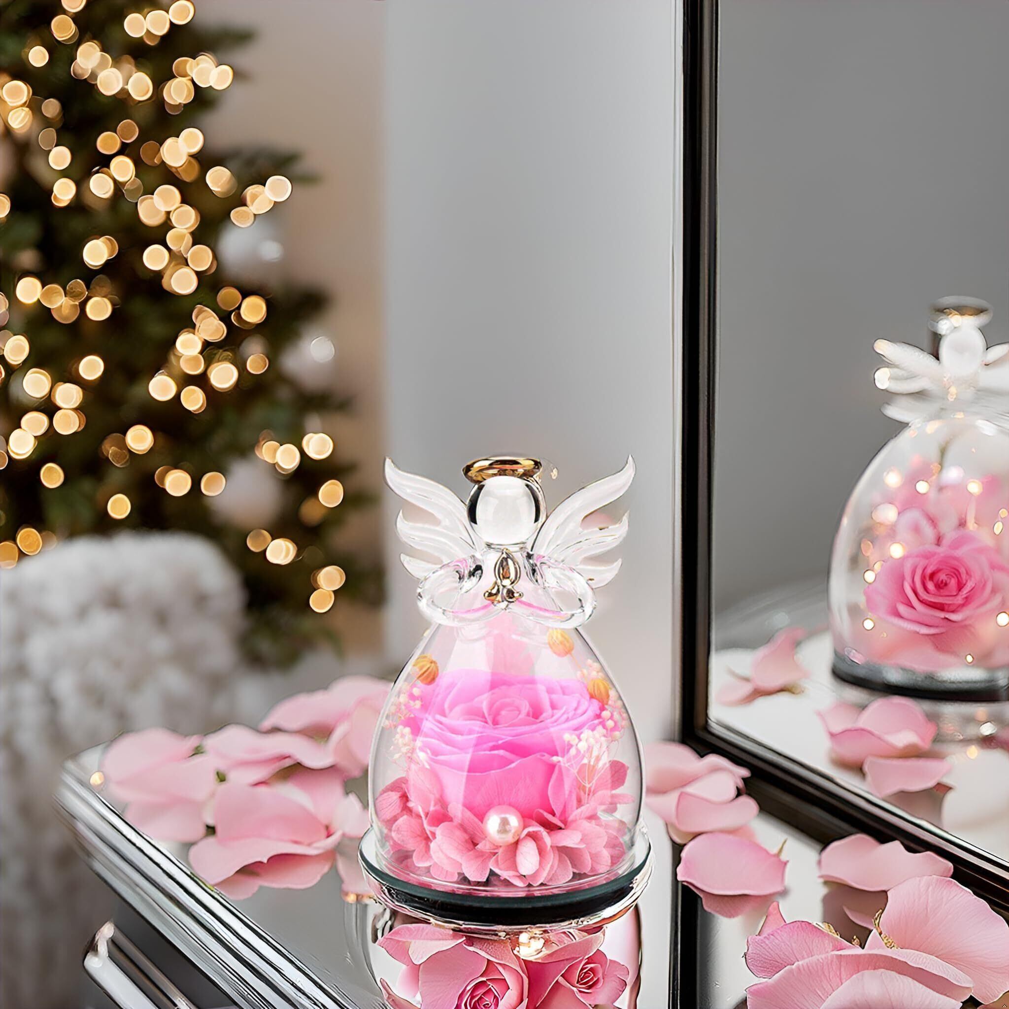 プリザーブドフラワー ギフト 天使 ガラスドーム バラ 贈り物 - 枯れない花 ブリザードフラワー 3〜5年長期保存 メッセージカード付 プレミアムボックス入 誕生日プレゼント 女性 母の日 退職祝い 還暦祝い 結婚記念日 (ピンク) | kki