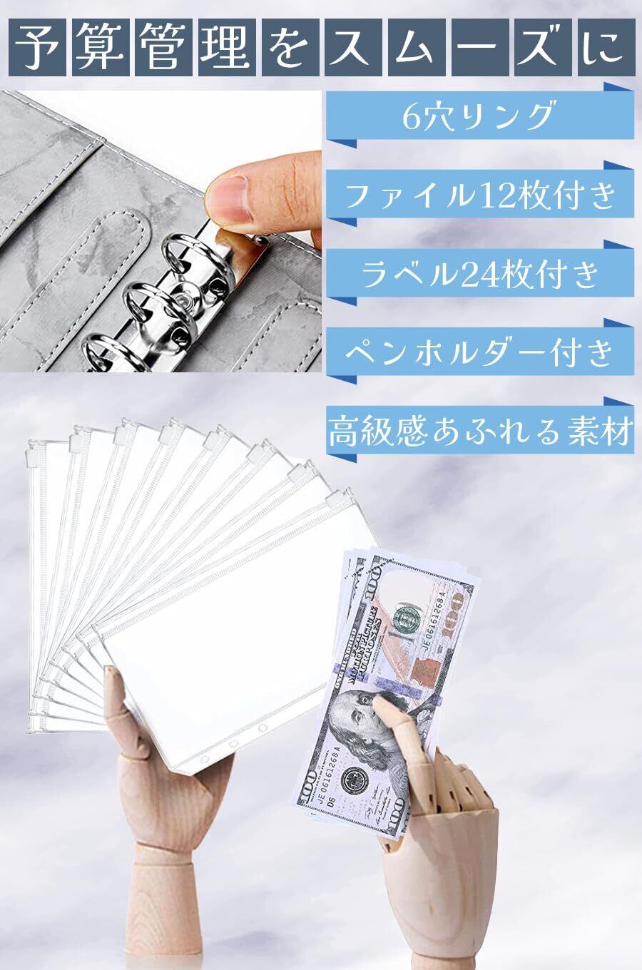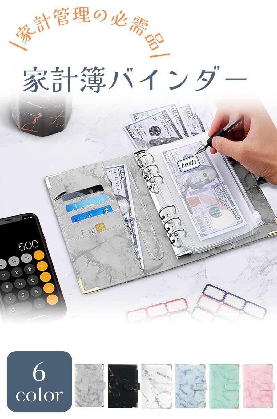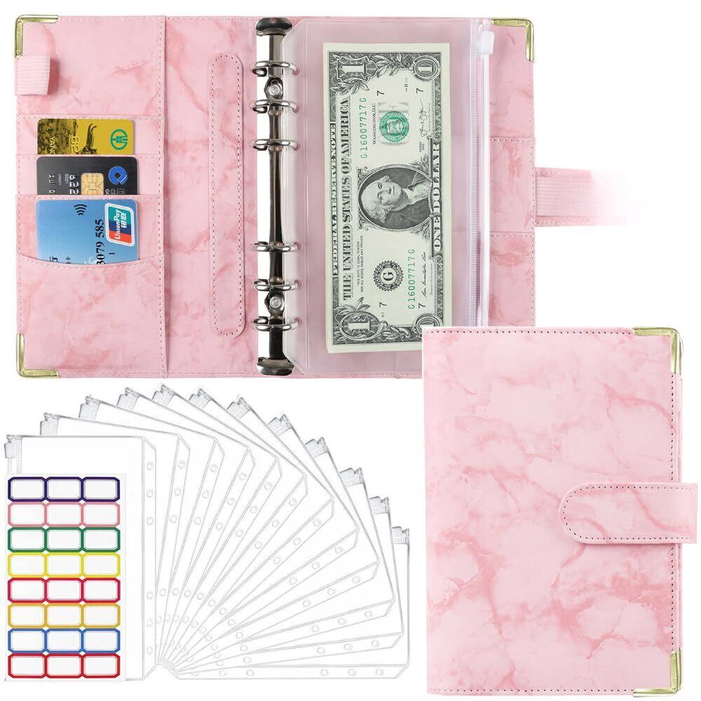ideamall 家計管理 ポーチ 家計簿 予算バインダー ファイル ポケット12個付き お金管理 予算管理 大理石 A6 (ピンク)