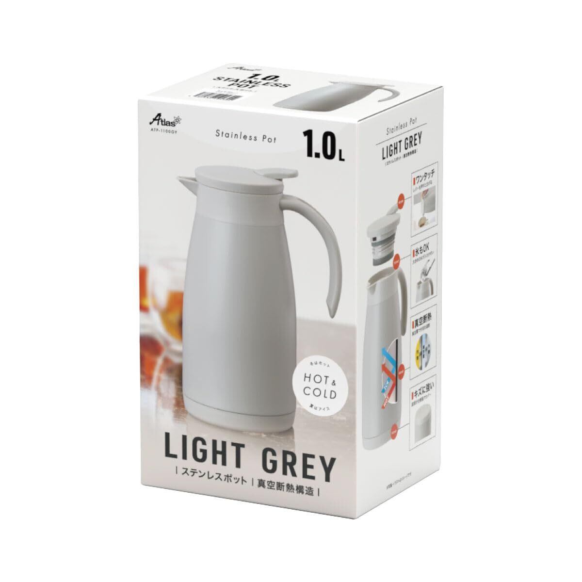 アトラス 保冷ポット 保温ポット 1L 軽量スリム 節電 省エネ 卓上ポット ステンレスポット 魔法瓶 保温 保冷 真空断熱二重構造 洗いやすい ワンタッチレバー 広口 グレー 白湯 ATP-1100GY | kki
