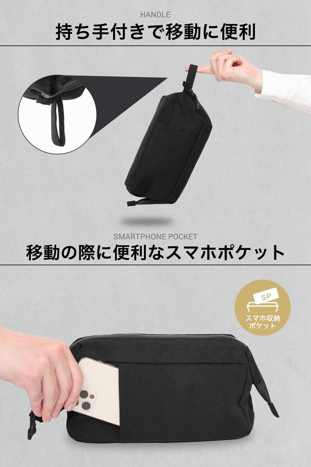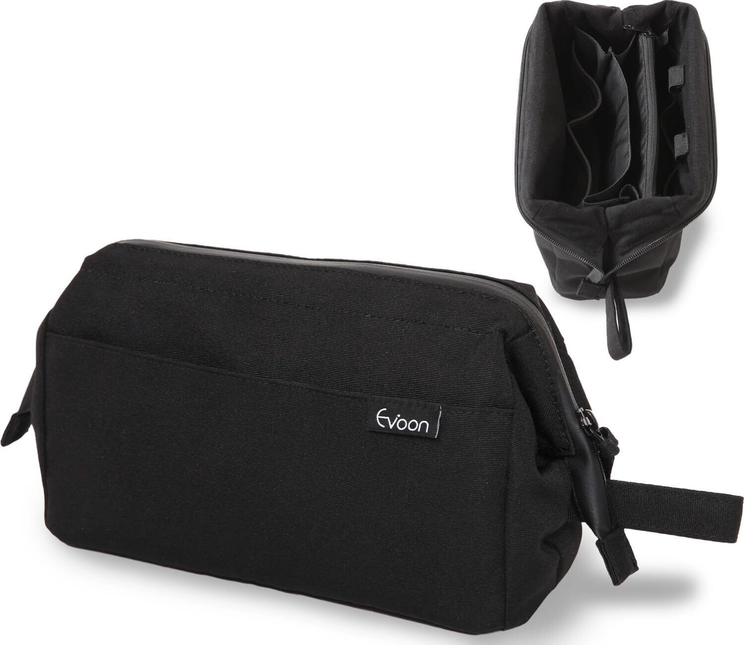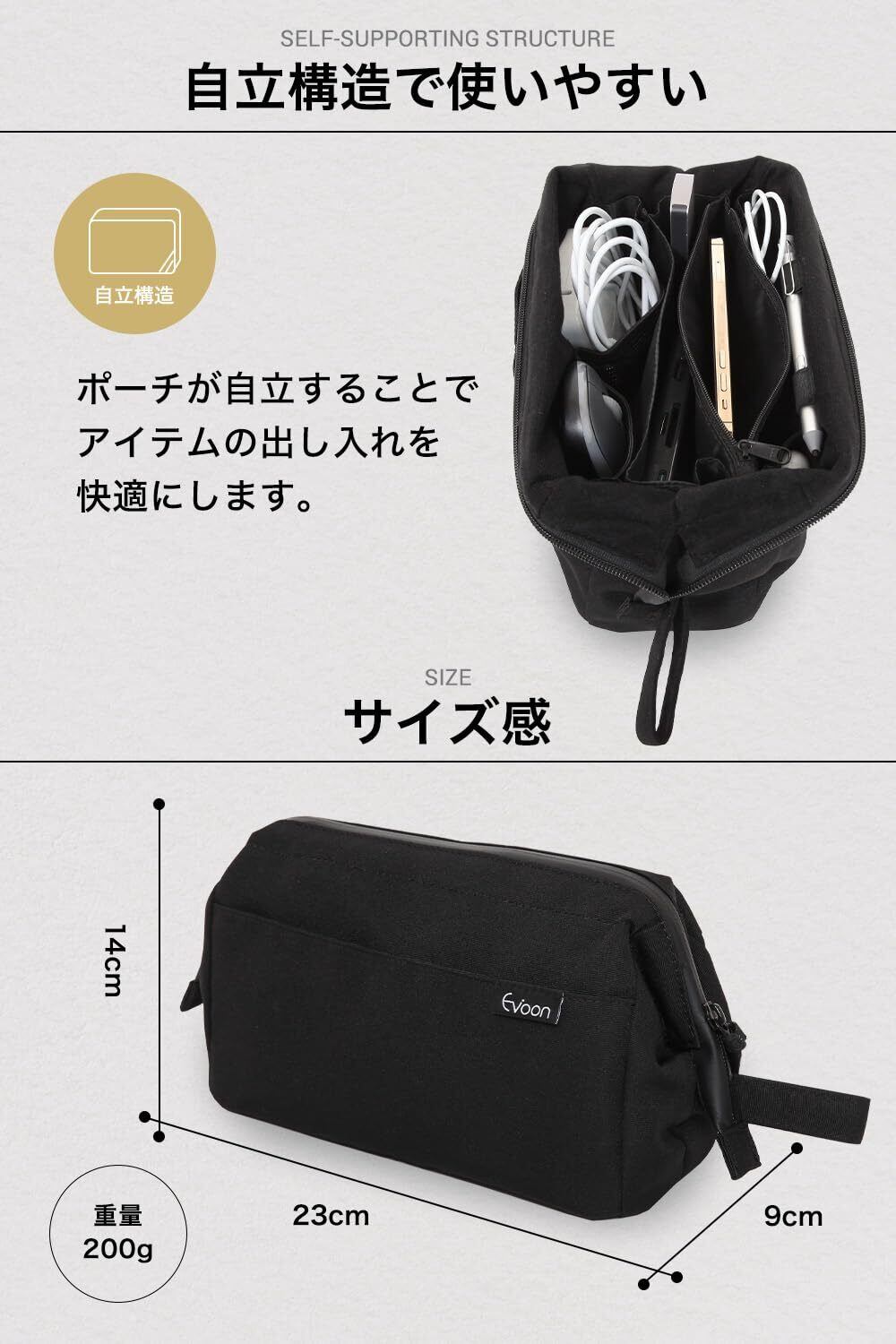 Evoon かわるガジェットポーチ 大容量 ガジェット ポーチ がま口で中が見えやすい トラベルポーチ 持ち手付き ガジェットケース 収納ポーチ 撥水 ブラック