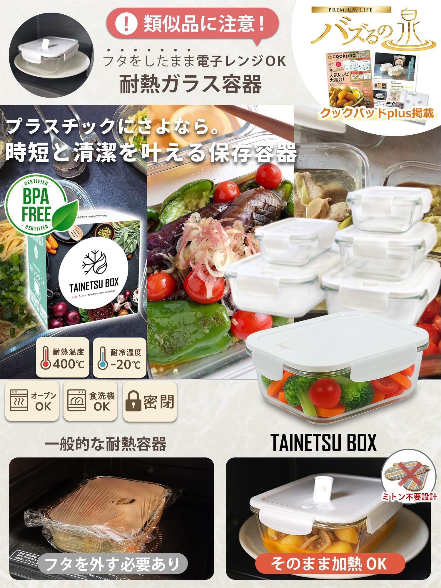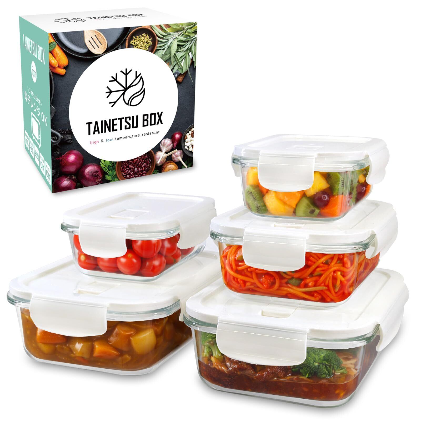ガラス タッパー 完全密閉 【料理専門家推薦】 フタしたままレンジOK 耐熱ガラス 保存容器 BPAフリー TAINETSU BOX (5個セット)