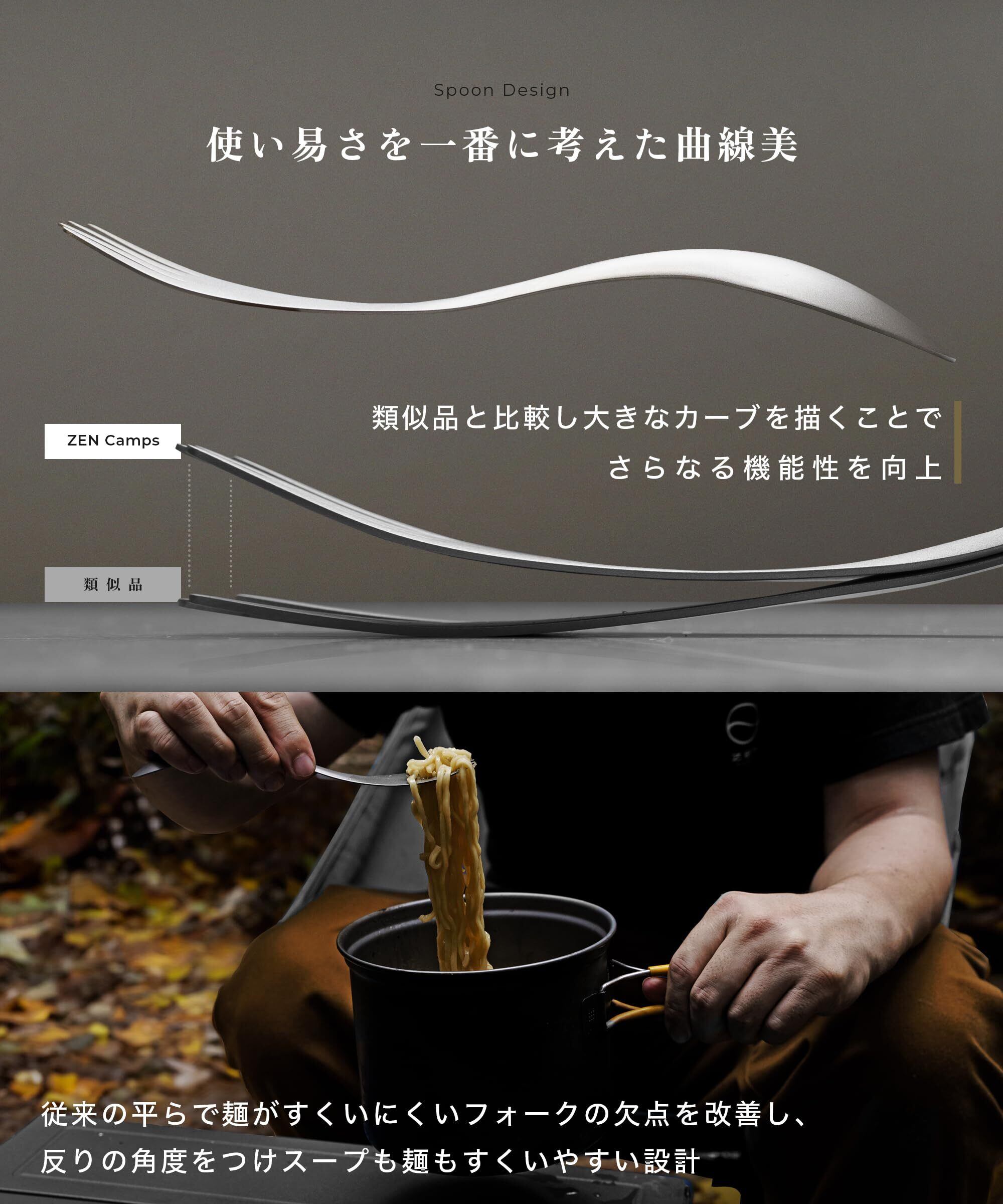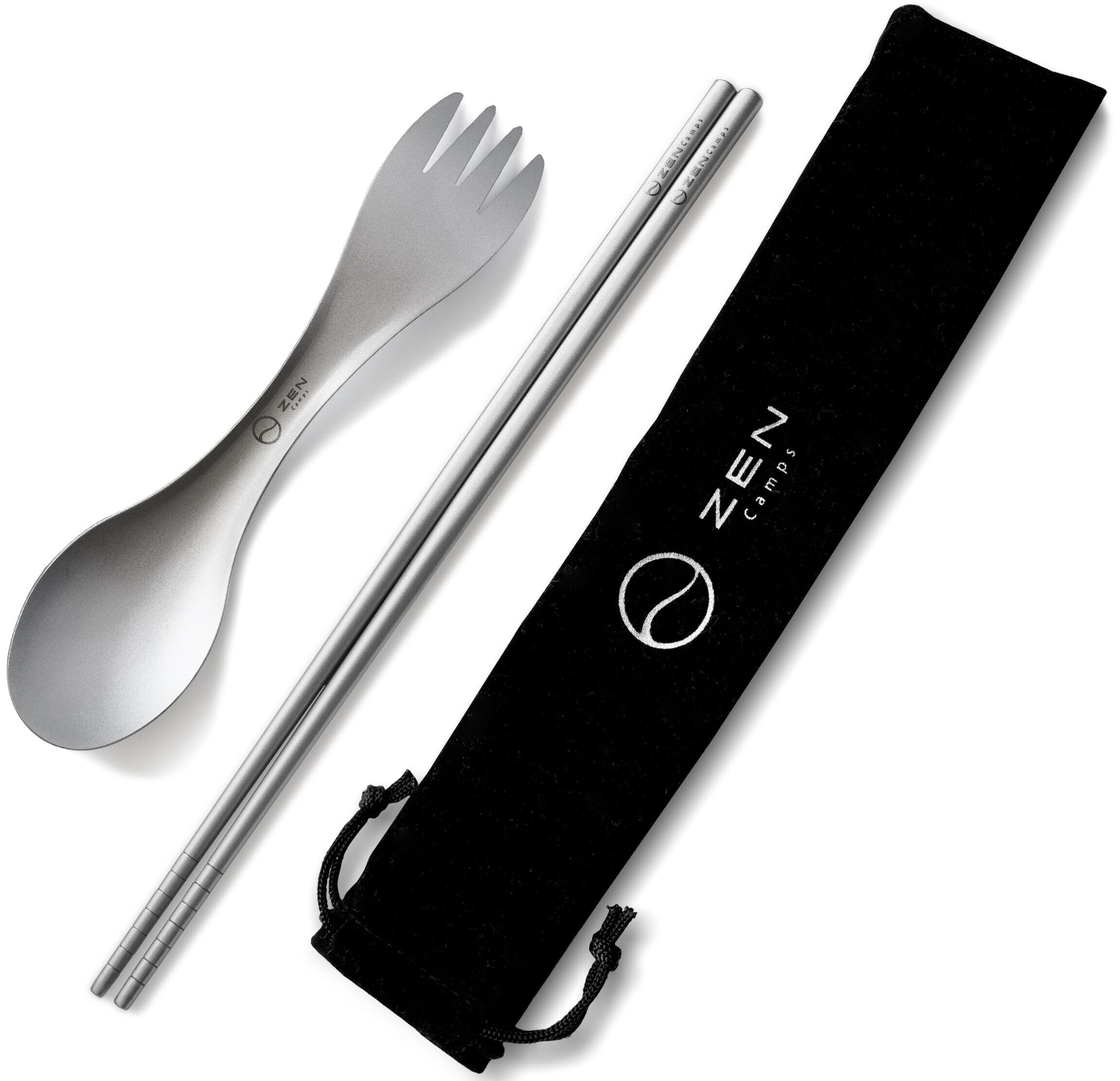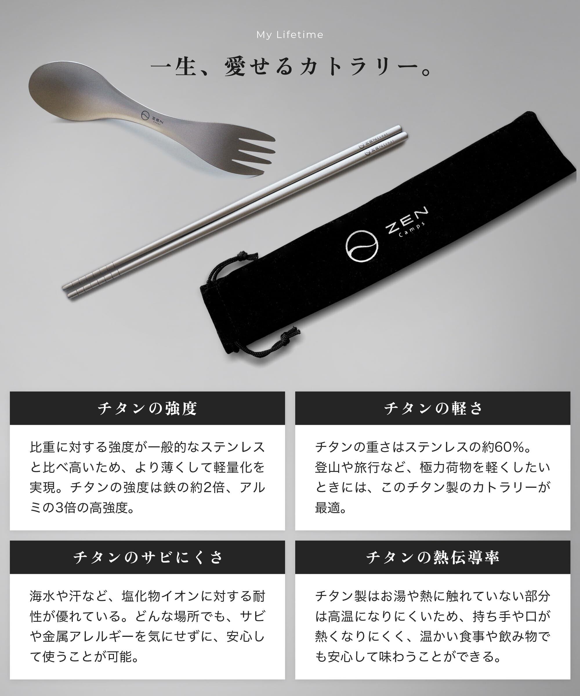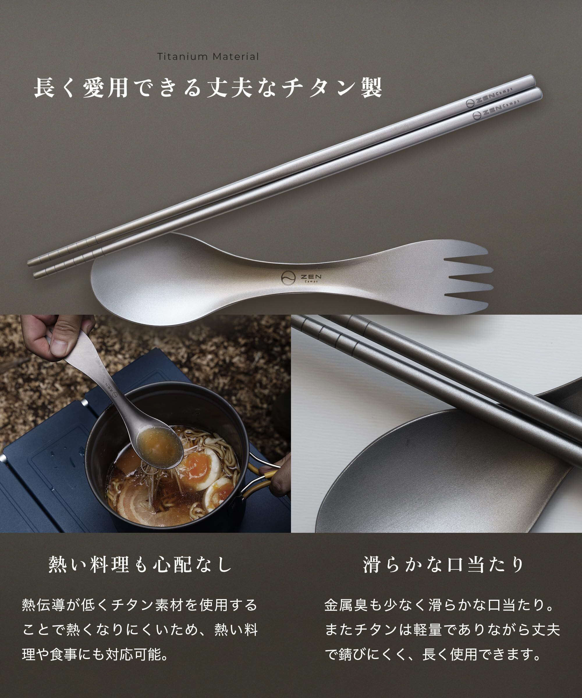 ZEN Camps チタン カトラリーセット 箸 スプーン フォーク クッカー 調理器具 超軽量 アウトドア 登山 キャンプ 収納袋付 (セット)