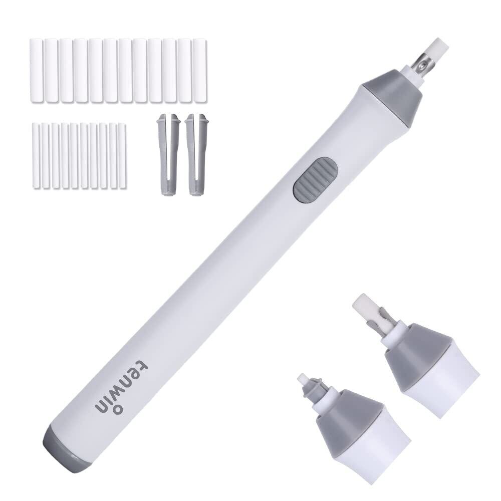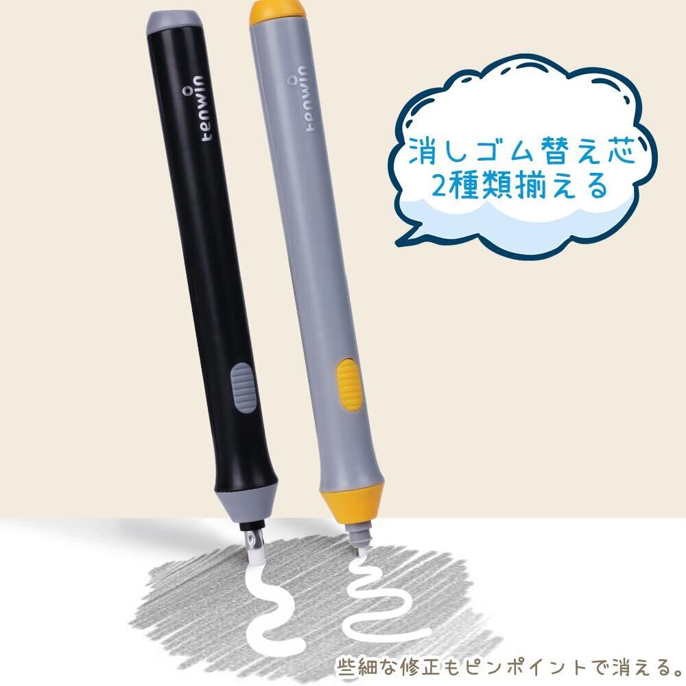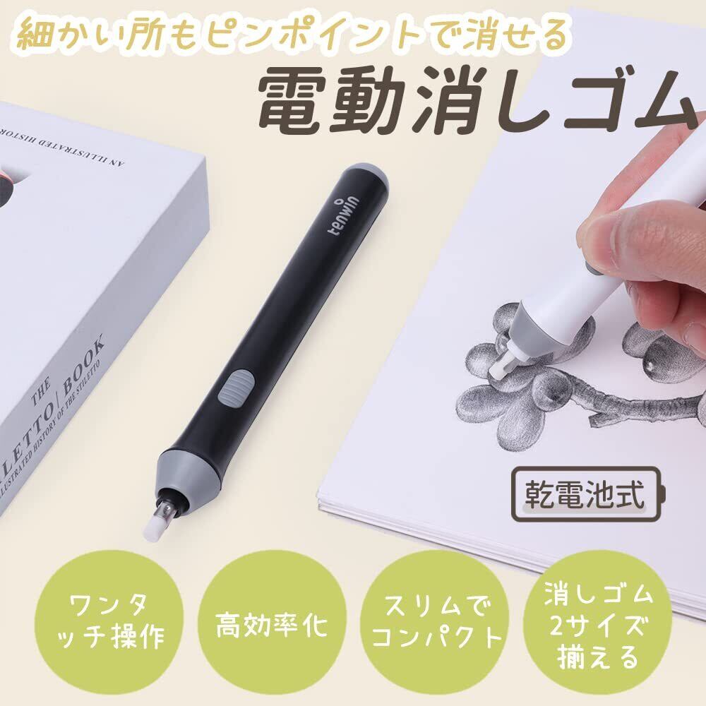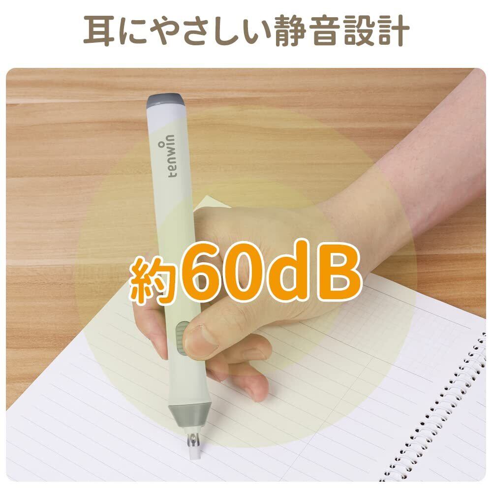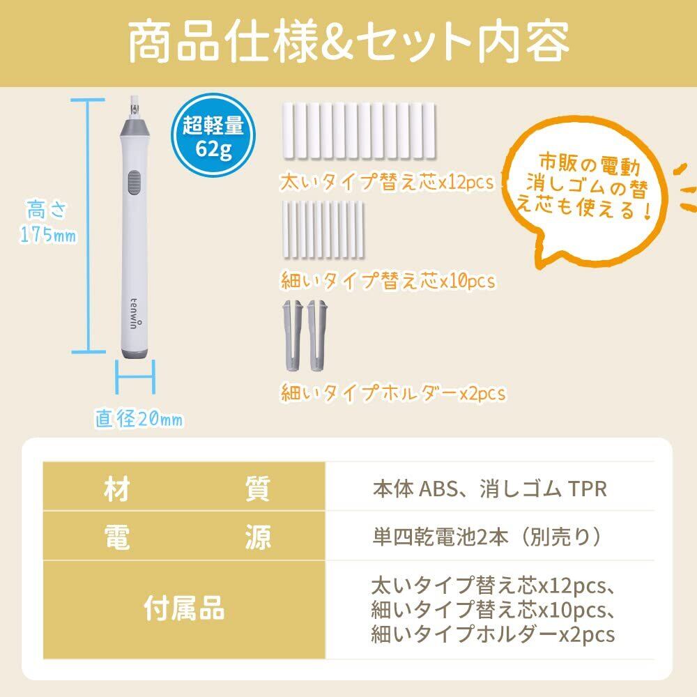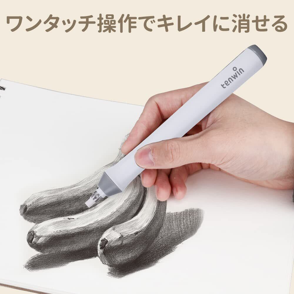 Tenwin電動消しゴム 電動字消器 パワフル よく消える 静音 筆形 取り換え用 消しゴム22本付き 学生用 文房具 オフィス用品 図面 楽譜 建築企画 絵画 電池式 ホワイト