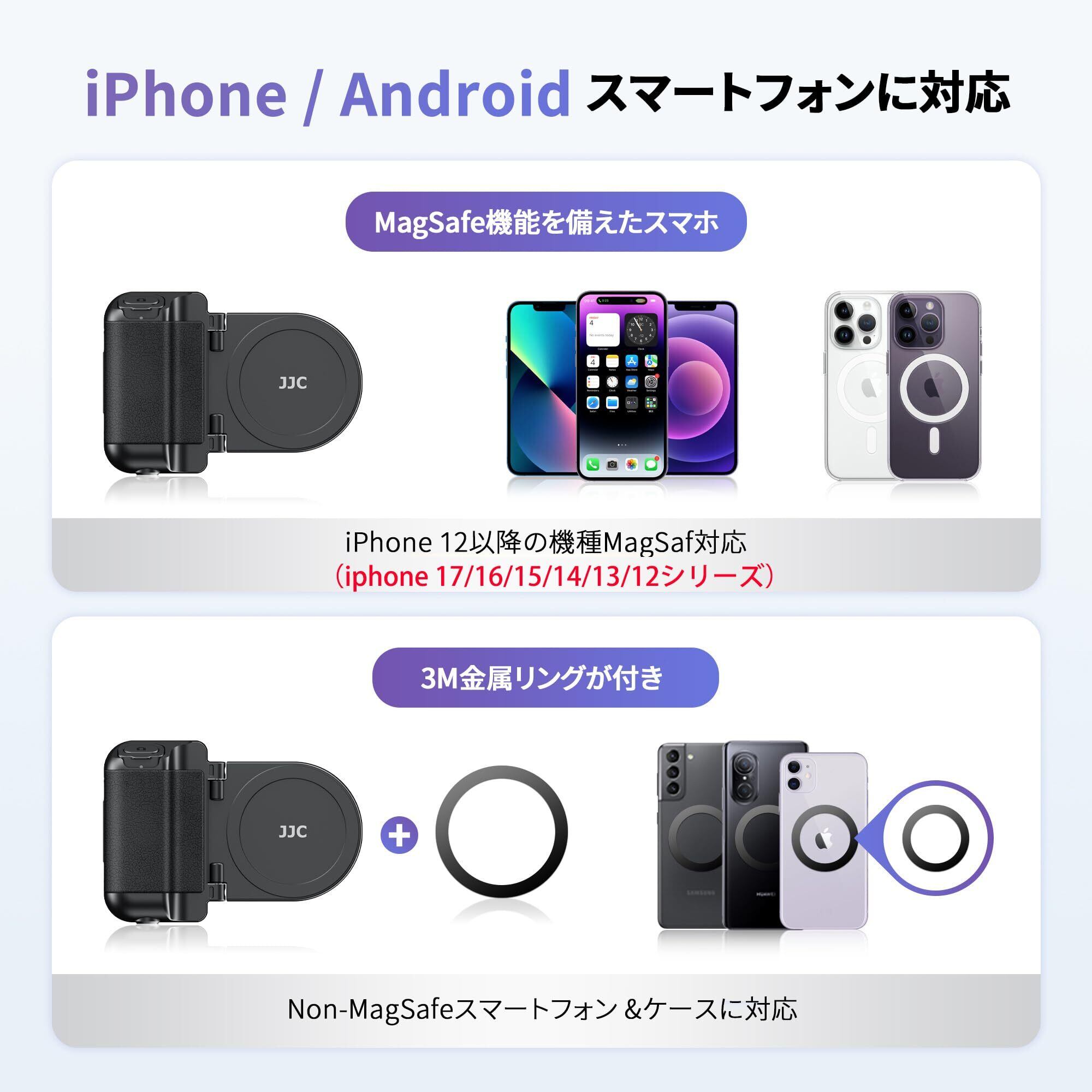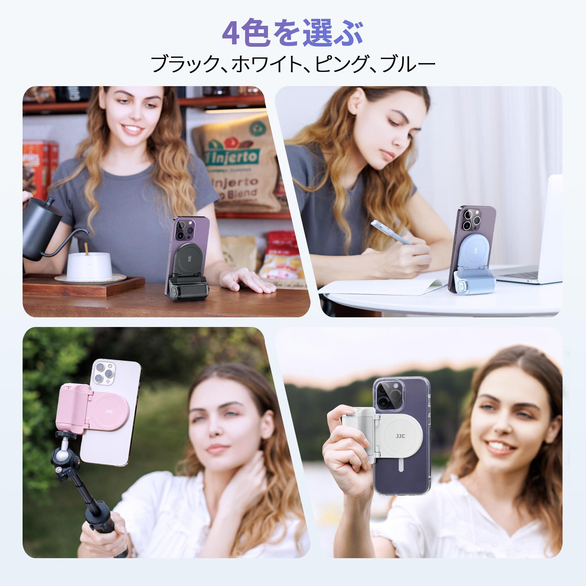 JJC Magsafe対応 スマホグリップ 自撮りグリップ マグネット スマホホルダー スマホスタンド ワイヤレスリモコン付き スマートフォンホルダー 1/4"ネジ穴付き 一脚 三脚 自撮り棒 iPhone 17 16 15 14 13 12 Pro Max Air Androidに対応 超强磁力 片手操作 自撮り 写真 Vlog ビデオ撮影に適用 ブラック | kki