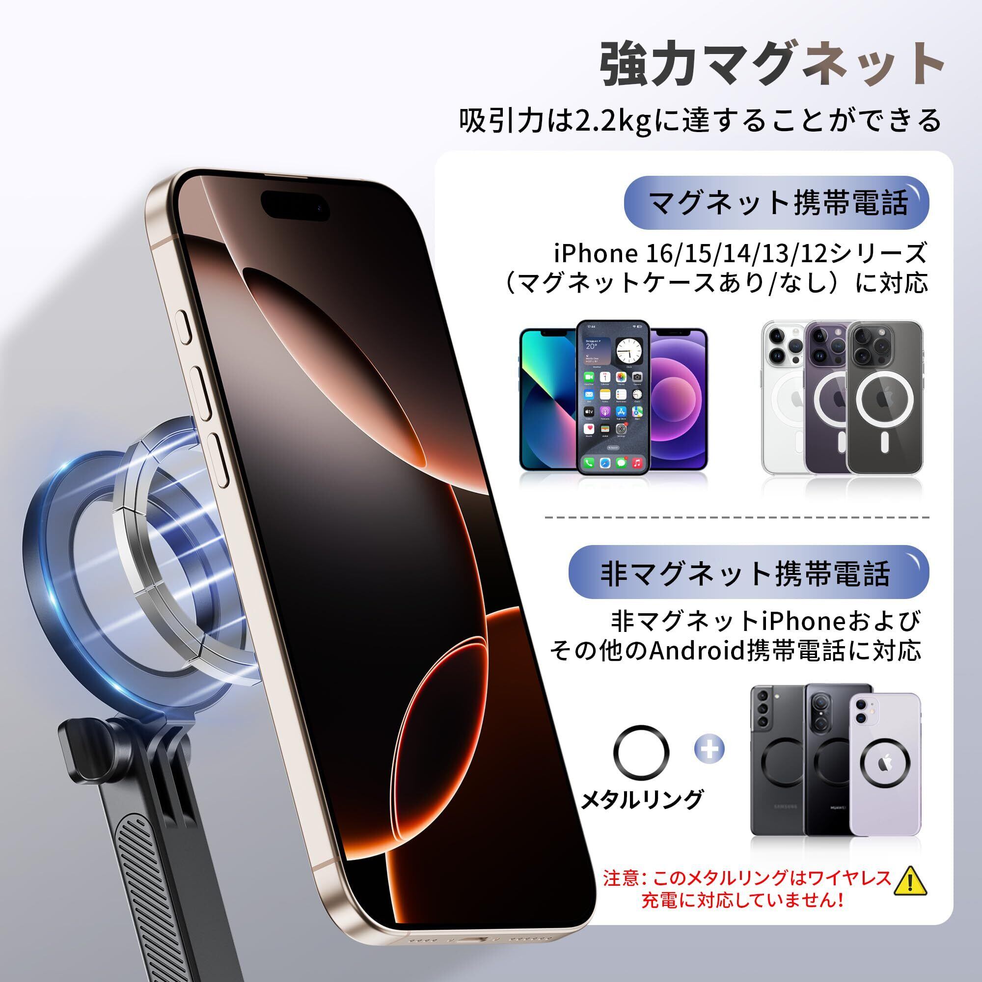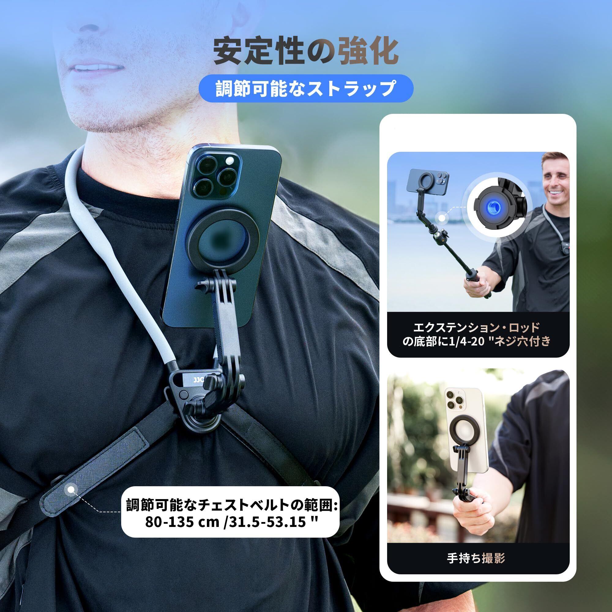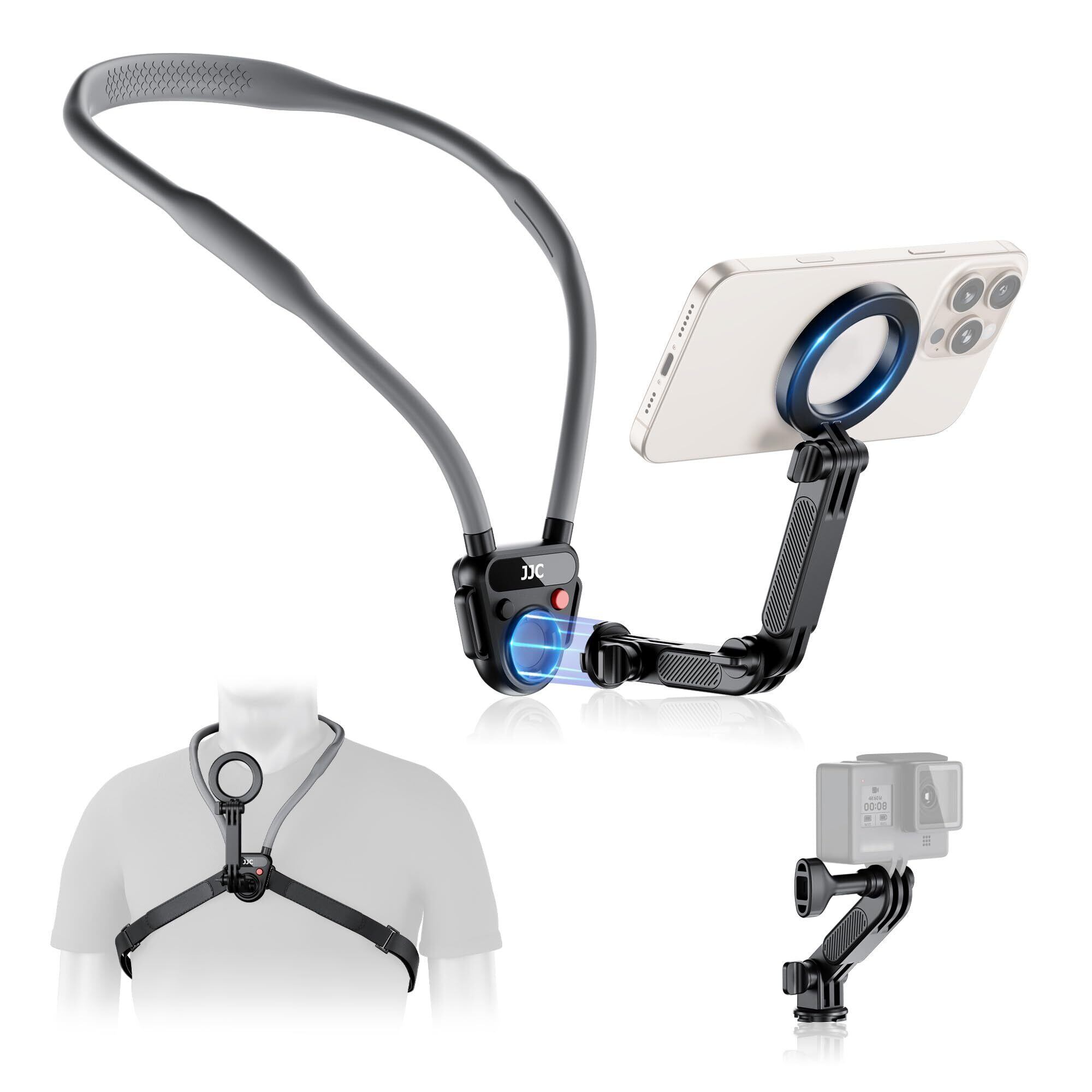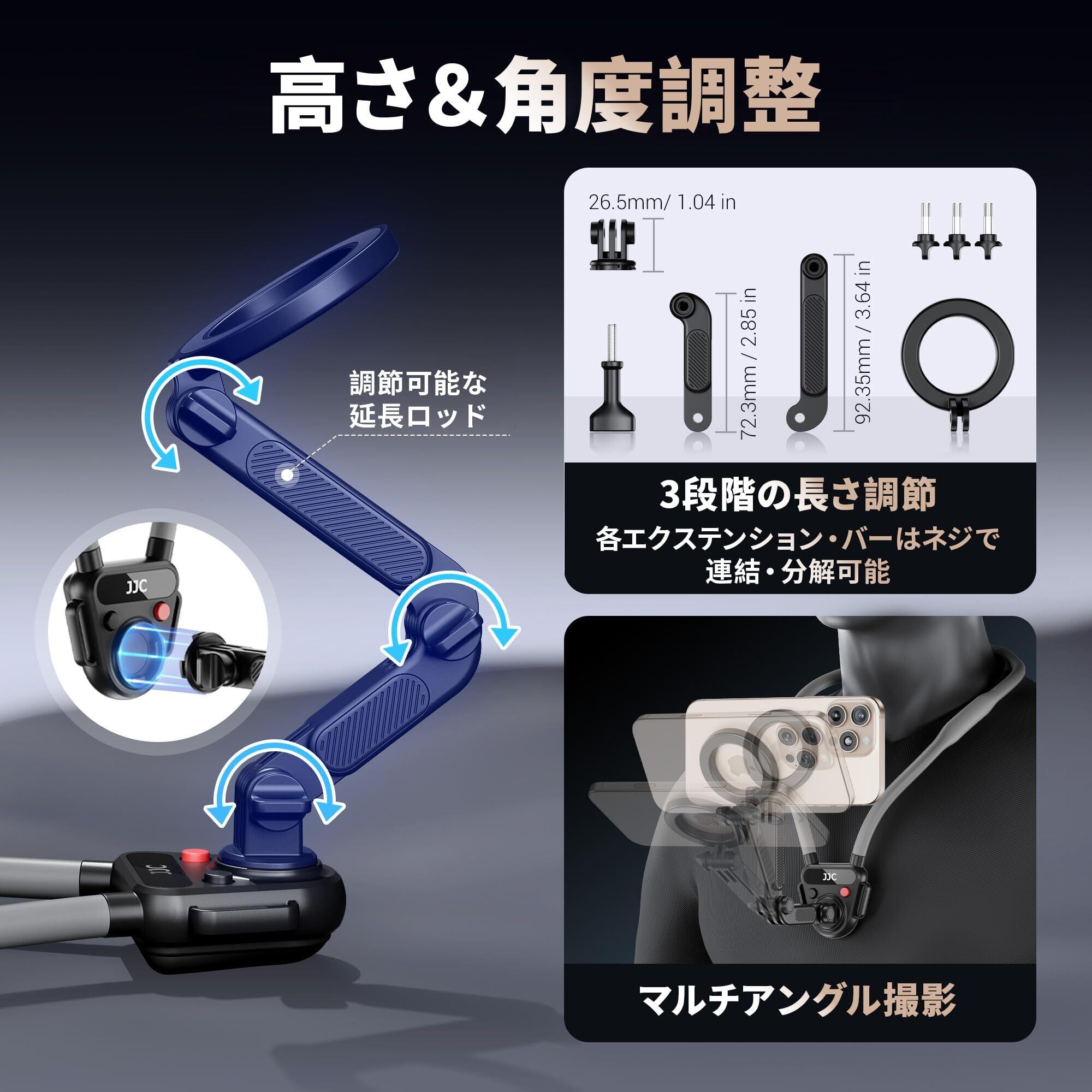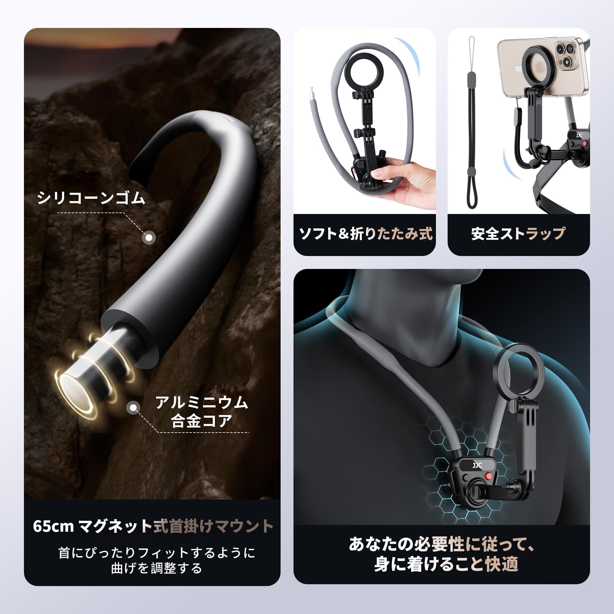 JJC POV 携帯電話首掛けホルダー Magsafe対応 GoPro Instax 360 Dji Osmo 360 に適合 IPhone 17 16 15 14 13 12 Plus Pro Max 対応 3段階マルチアングル調整可能 65cm延長設計スマホ首掛けホルダー アウトドアスポーツ VLog ライブ録画など POVアクセサリー | kki