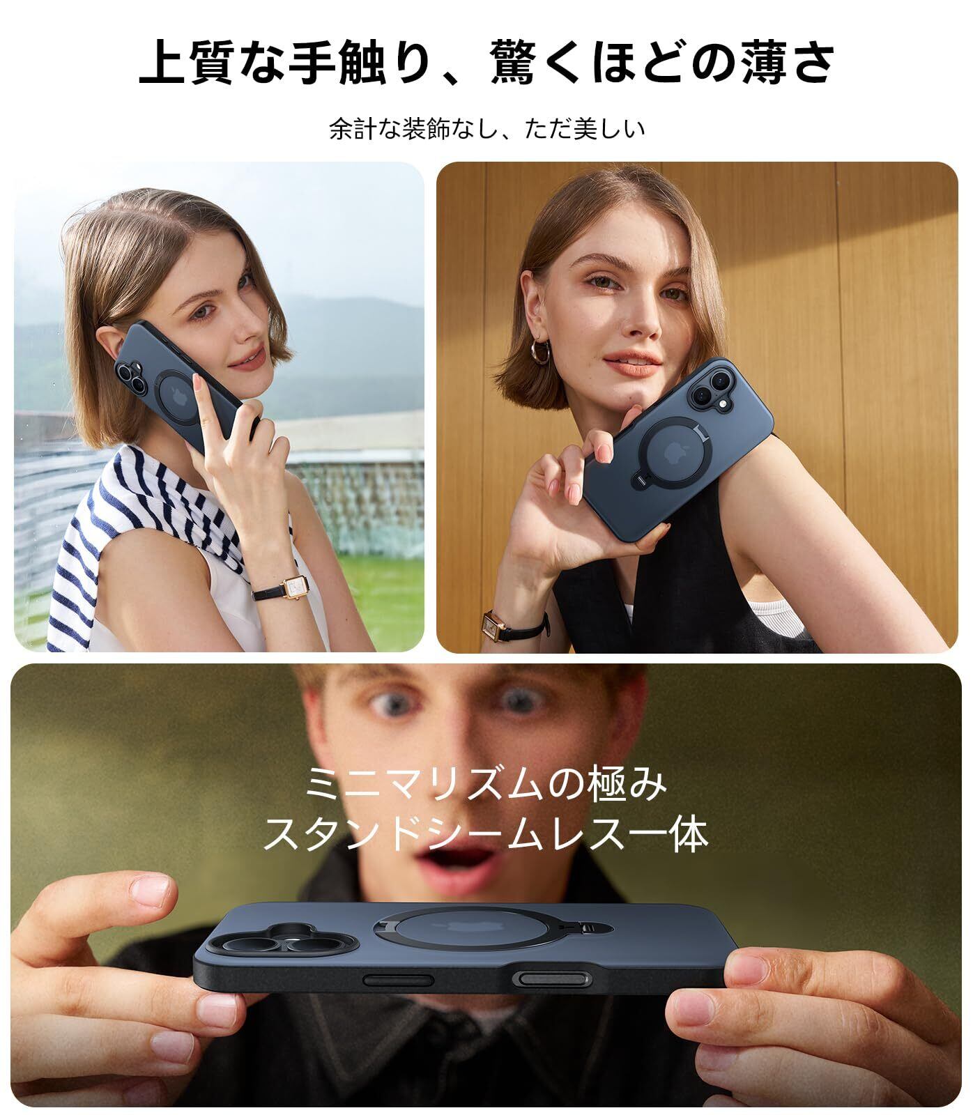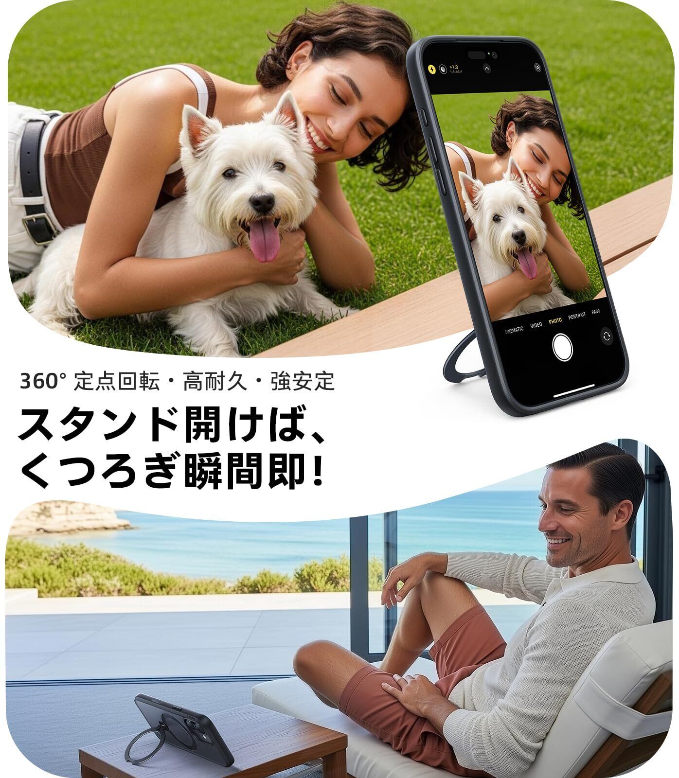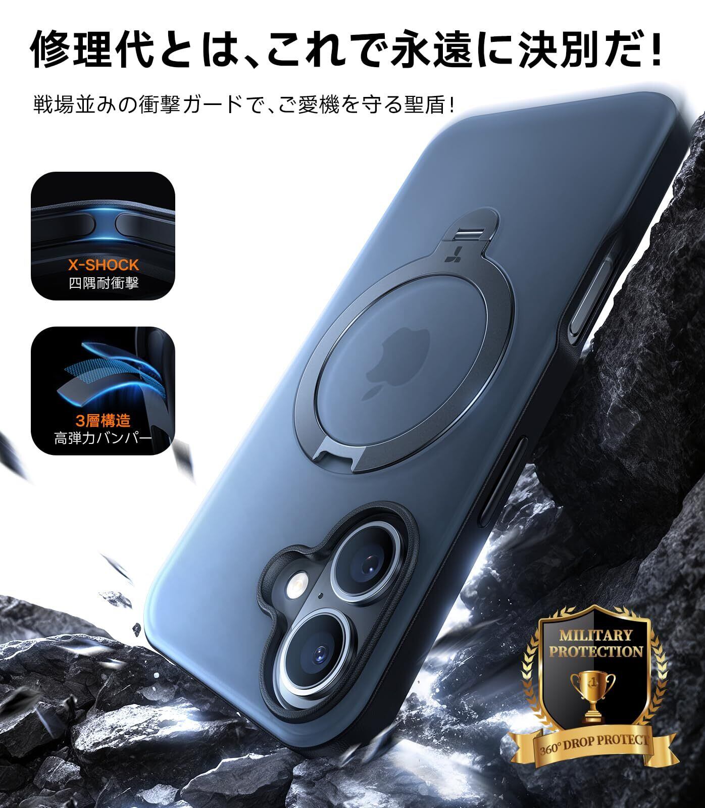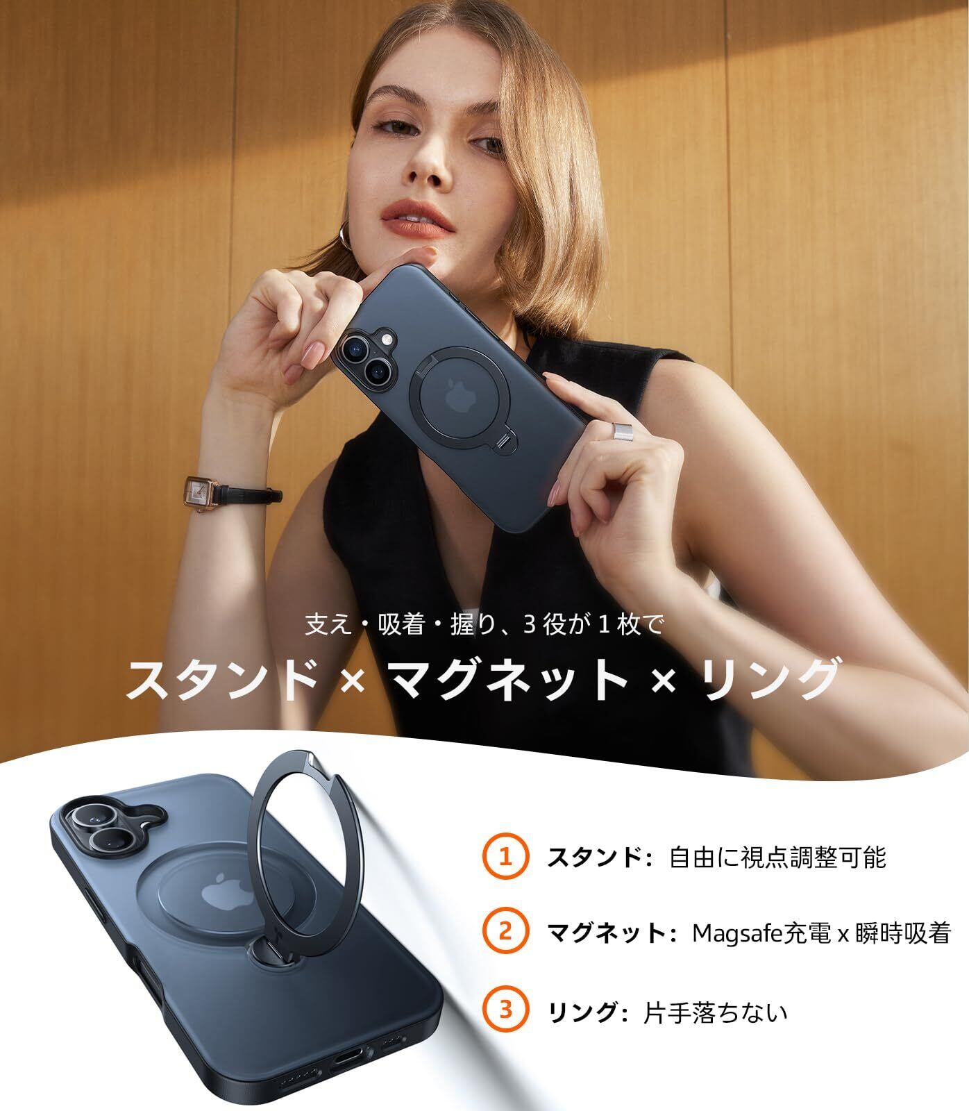 【多機能一体・360°新定点回転スタンド】TORRAS iPhone 16 用 ケース 縦横両対応 リング付き マグネット搭載 ワイヤレス充電対応 耐衝撃 防指紋 半透明 あいふおん16 用ケース Ostand Q3 Spin ブラック | kki